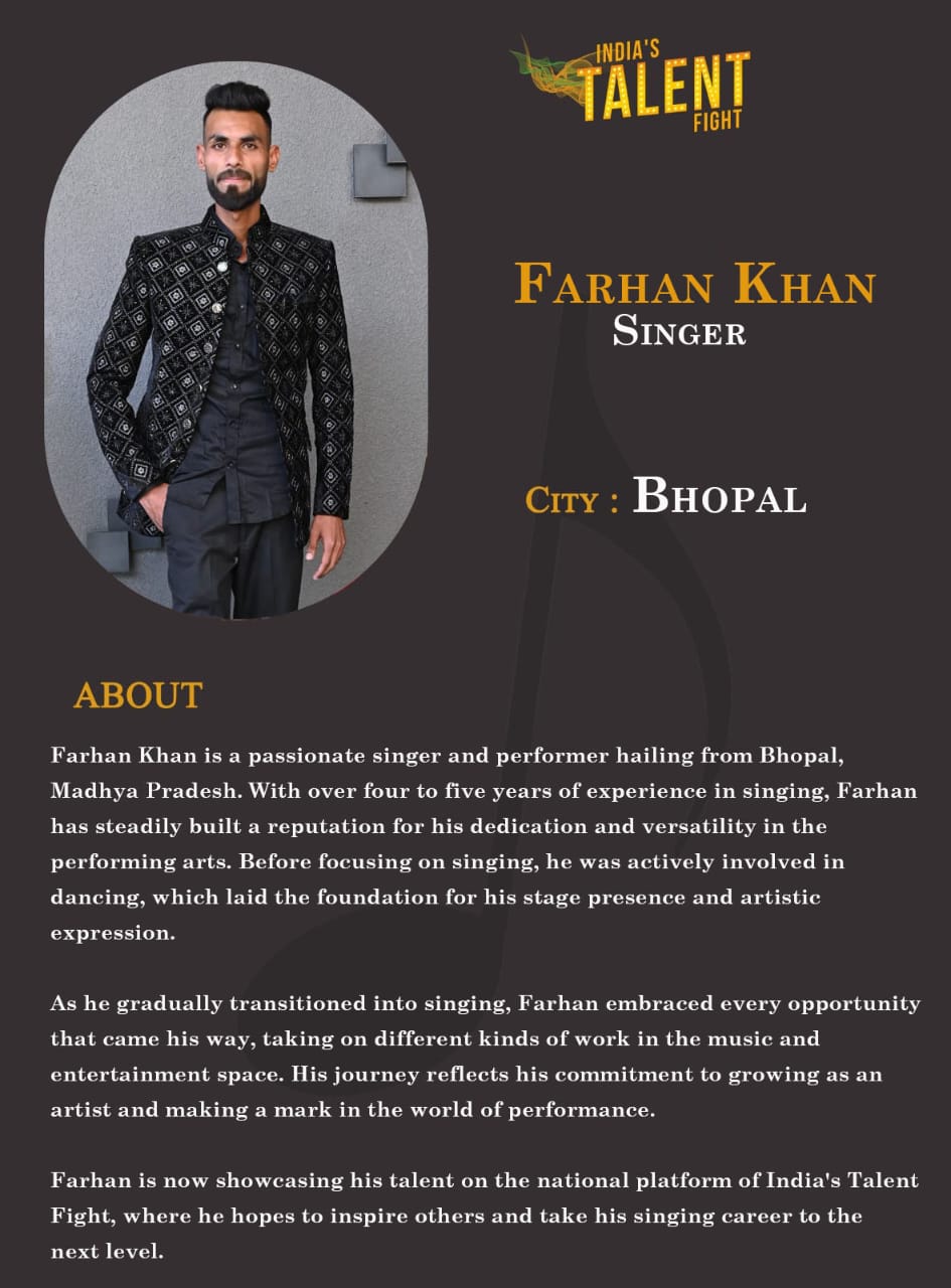 ITF Singer Farhan Khan BhopalFarhan Khan is a passionate singer and performer hailing from Bhopal, Madhya Pradesh. With over four to five years of experience in singing, Farhan has steadily built a reputation for his dedication and versatility in the performing arts. Before focusing on singing, he was actively involved in dancing, which laid the foundation for his stage presence and artistic expression.As he gradually transitioned into singing, Farhan embraced every opportunity that came his