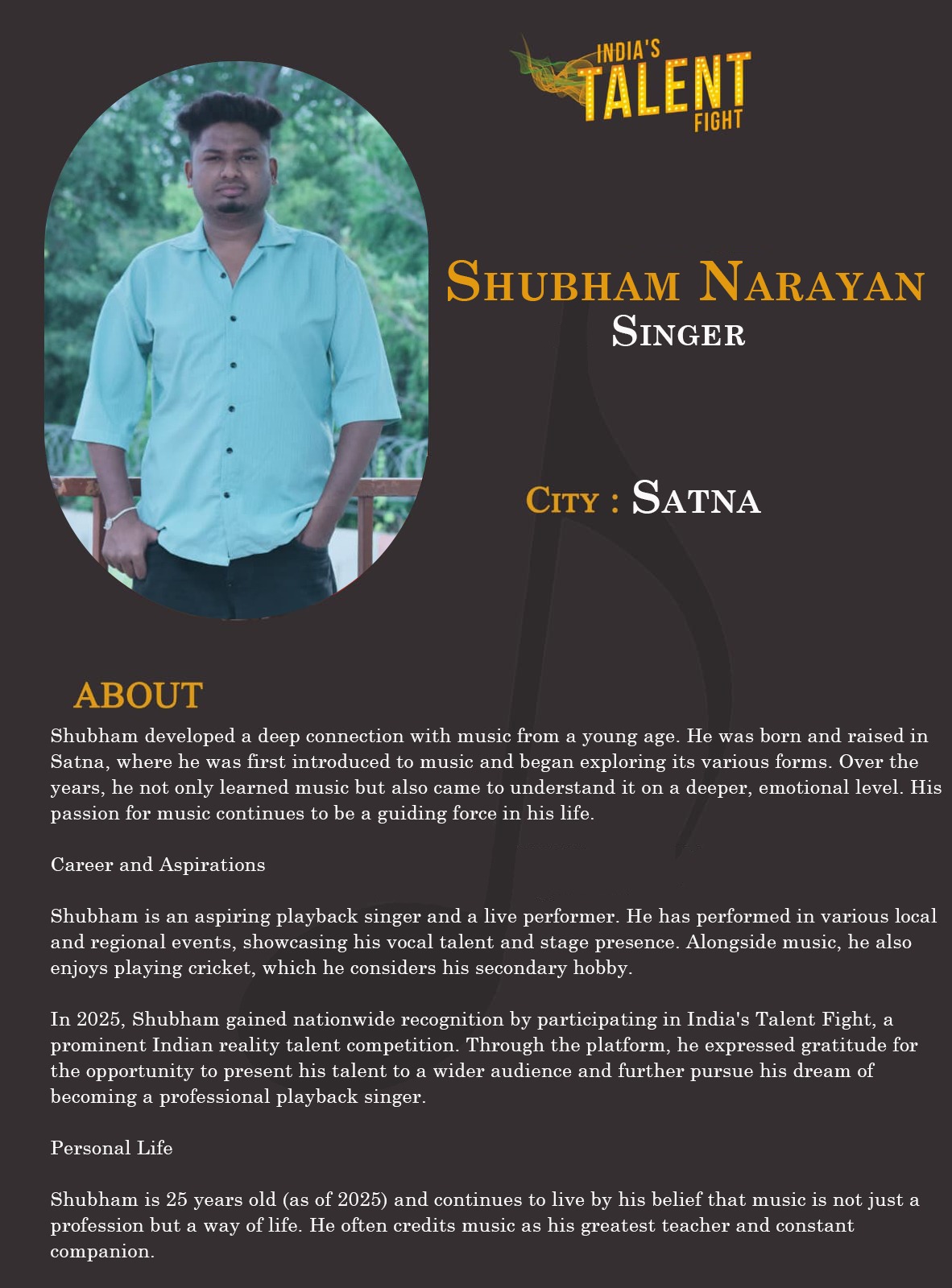 ITF Singer Shubham Narayan SatnaShubham developed a deep connection with music from a young age. He was born and raised in Satna, where he was first introduced to music and began exploring its various forms. Over the years, he not only learned music but also came to understand it on a deeper, emotional level. His passion for music continues to be a guiding force in his life.Career and AspirationsShubham is an aspiring playback singer and
