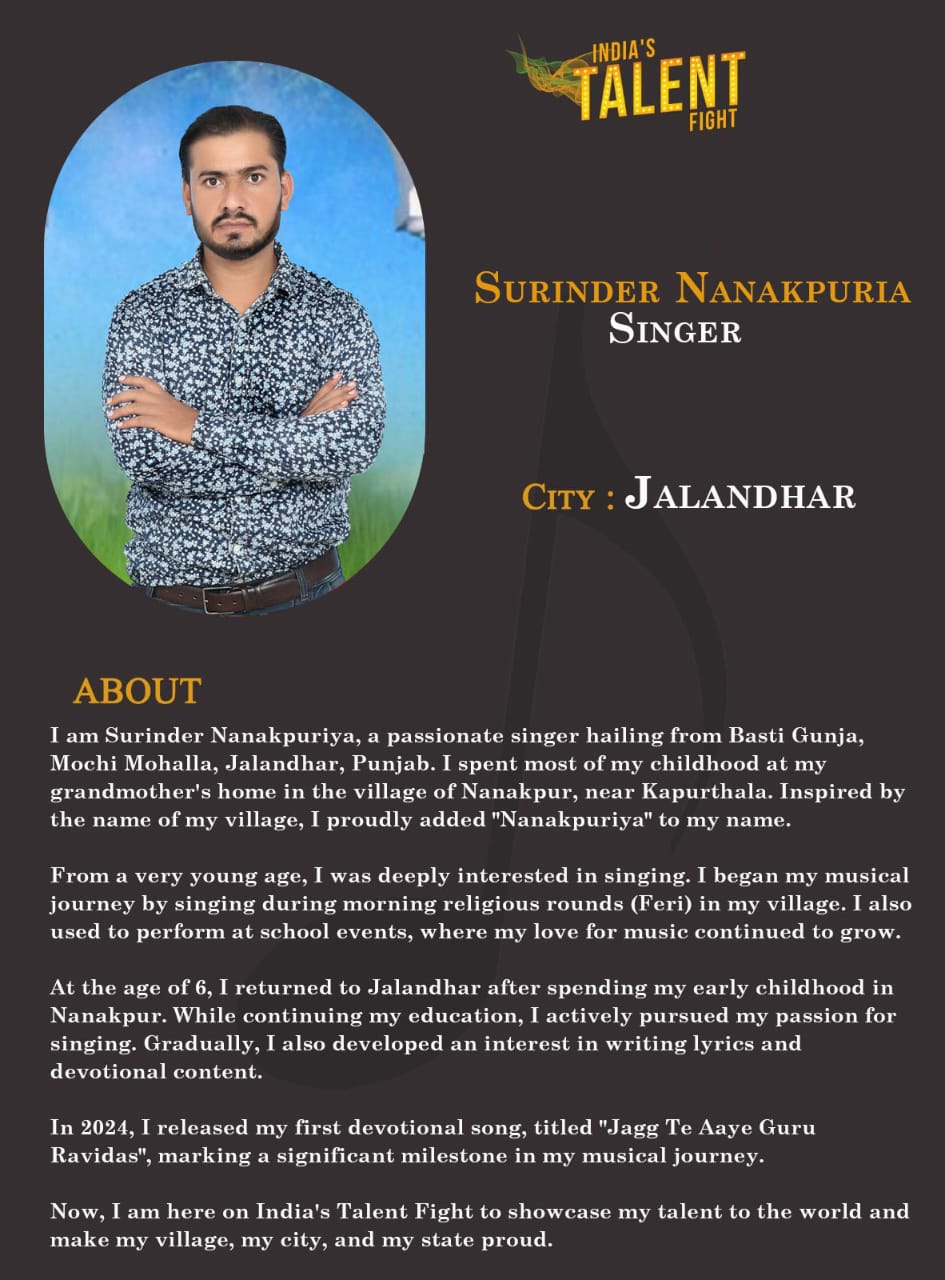 ITF Singer Surinder Nanakpuria JalandharI am Surinder Nanakpuriya, a passionate singer hailing from Basti Gunja, Mochi Mohalla, Jalandhar, Punjab. I spent most of my childhood at my grandmother’s home in the village of Nanakpur, near Kapurthala. Inspired by the name of my village, I proudly added “Nanakpuriya” to my name.From a very young age, I was deeply interested in singing. I began my musical journey by singing during morning religious rounds (Feri) in my village.