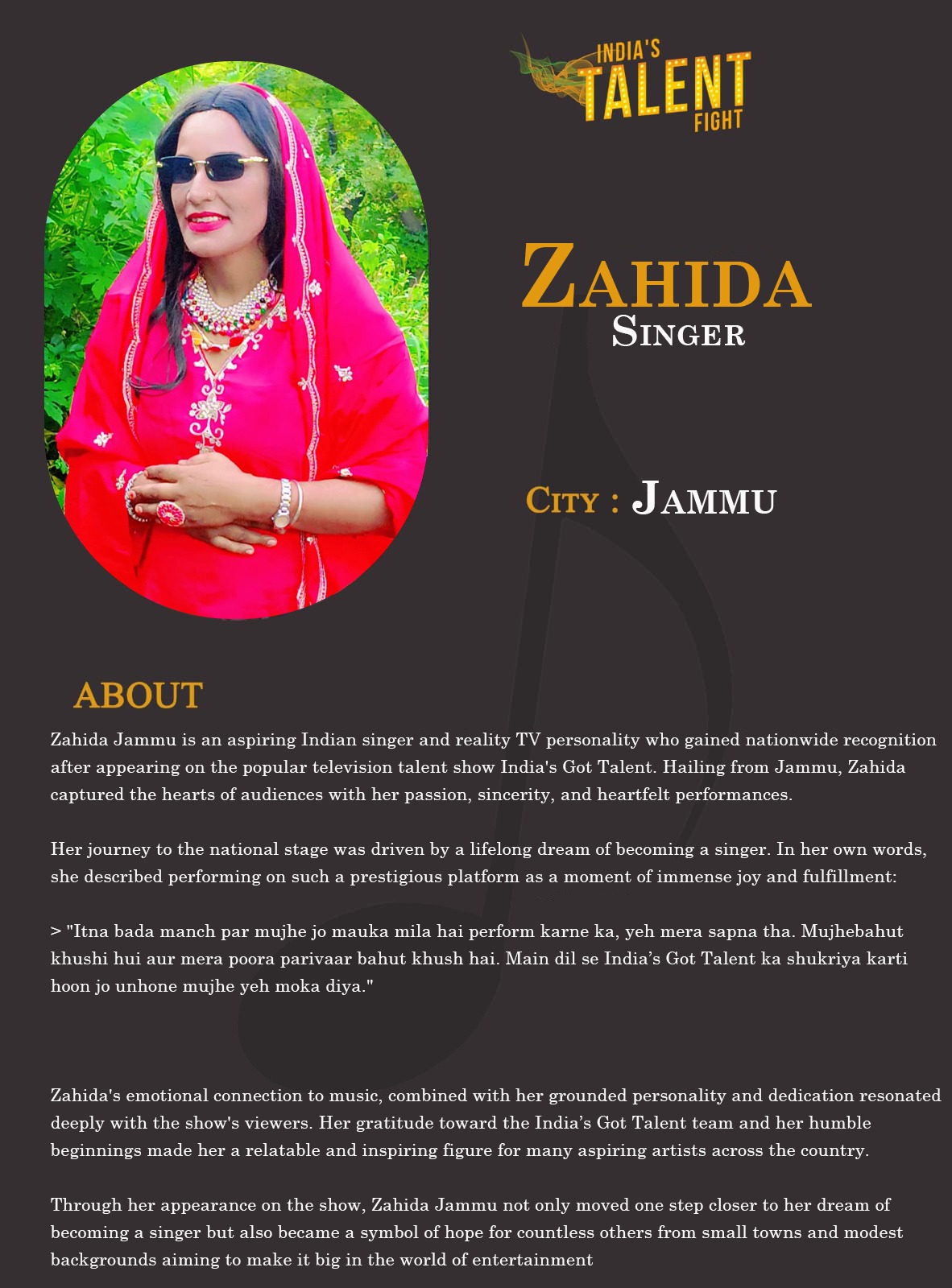 ITF Singer Zahida jammuZahida Jammu is an aspiring Indian singer and reality TV personality who gained nationwide recognition after appearing on the popular television talent show India’s Got Talent. Hailing from Jammu, Zahida captured the hearts of audiences with her passion, sincerity, and heartfelt performances.Her journey to the national stage was driven by a lifelong dream of becoming a singer. In her own words, she described performing on such a prestigious platform as a moment