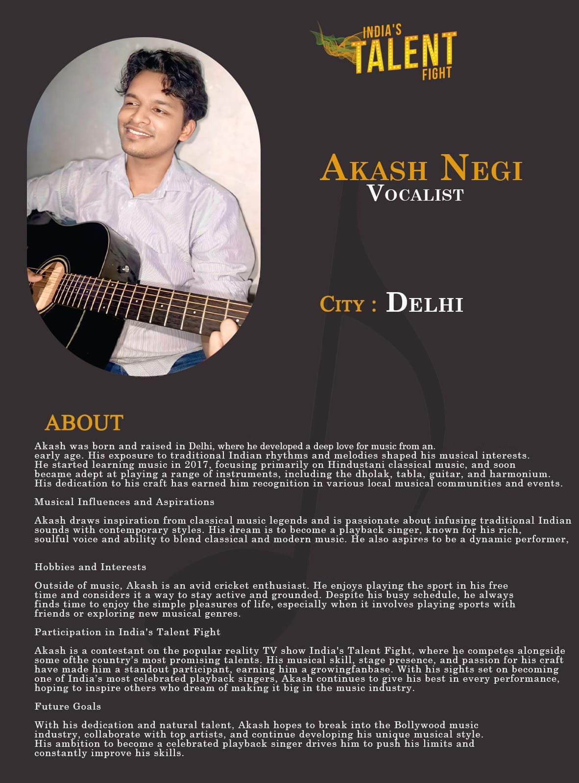 ITF Vocalist Akash Negi DelhiAkash was born and raised in Delhi, where he developed a deep love for music from an early age. His exposure to traditional Indian rhythms and melodies shaped his musical interests. He started learning music in 2017, focusing primarily on Hindustani classical music, and soon became adept at playing a range of instruments, including the dholak, tabla, guitar, and harmonium. His dedication to his craft has earned him recognition in various