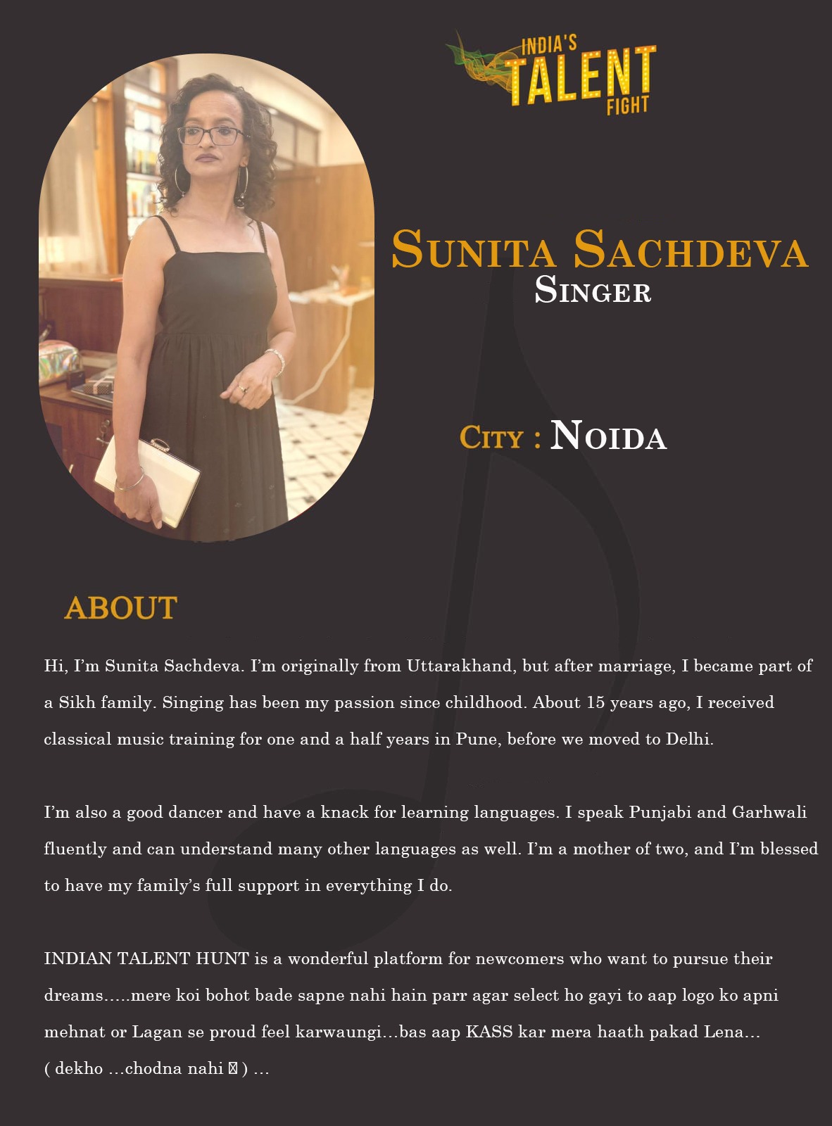 ITF Singer Sunita Sachdeva NoidaHi, I’m Sunita Sachdeva. I’m originally from Uttarakhand, but after marriage, I became part of a Sikh family. Singing has been my passion since childhood. About 15 years ago, I received classical music training for one and a half years in Pune, before we moved to Delhi.I’m also a good dancer and have a knack for learning languages. I speak Punjabi and Garhwali fluently and can understand many other languages as