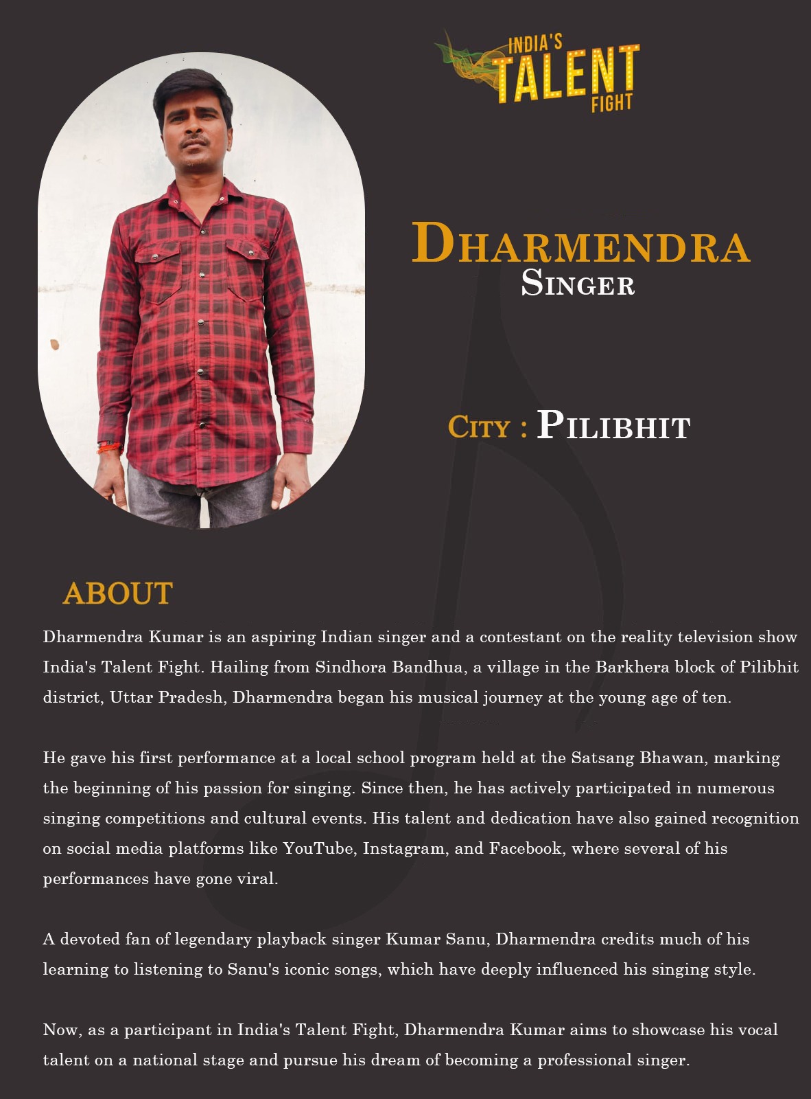 ITF Singer Dharmendra PilibhitDharmendra Kumar is an aspiring Indian singer and a contestant on the reality television show India’s Talent Fight. Hailing from Sindhora Bandhua, a village in the Barkhera block of Pilibhit district, Uttar Pradesh, Dharmendra began his musical journey at the young age of ten.He gave his first performance at a local school program held at the Satsang Bhawan, marking the beginning of his passion for singing. Since then, he has actively participated