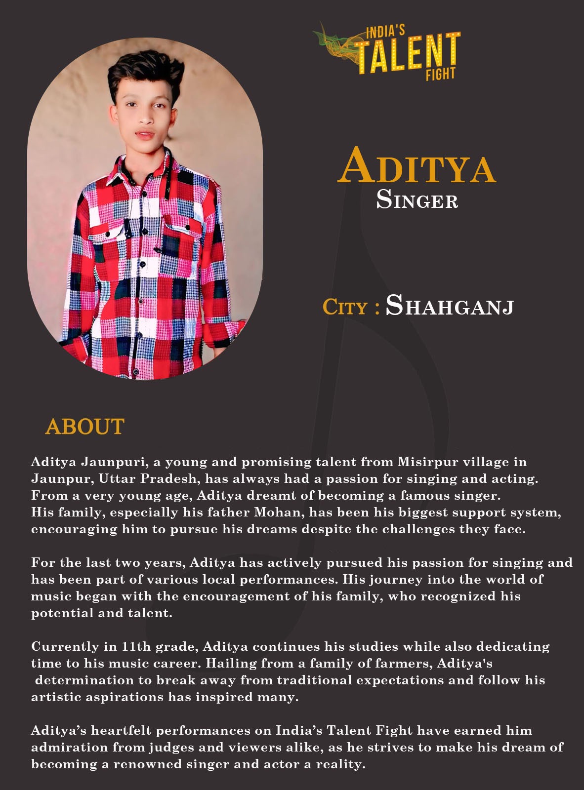 ITF Singer Aditya ShahganjAditya Jaunpuri, a young and promising talent from Misirpur village in Jaunpur, Uttar Pradesh, has always had a passion for singing and acting. From a very young age, Aditya dreamt of becoming a famous singer. His family, especially his father Mohan, has been his biggest support system, encouraging him to pursue his dreams despite the challenges they face.For the last two years, Aditya has actively pursued his passion for singing and has