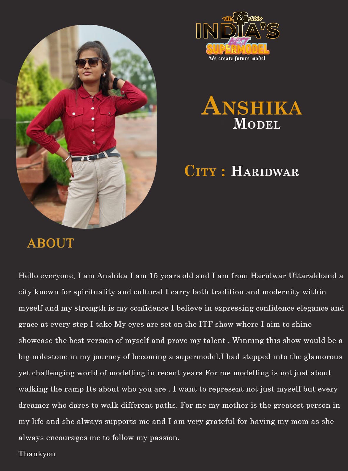 ITF Model Anshika HaridwarHello everyone, I am Anshika I am 15 years old and I am from Haridwar Uttarakhand a city known for spirituality and cultural I carry both tradition and modernity within myself and my strength is my confidence I believe in expressing confidence elegance and grace at every step I take My eyes are set on the ITF show where I aim to shine showcase the best version of myself and prove my