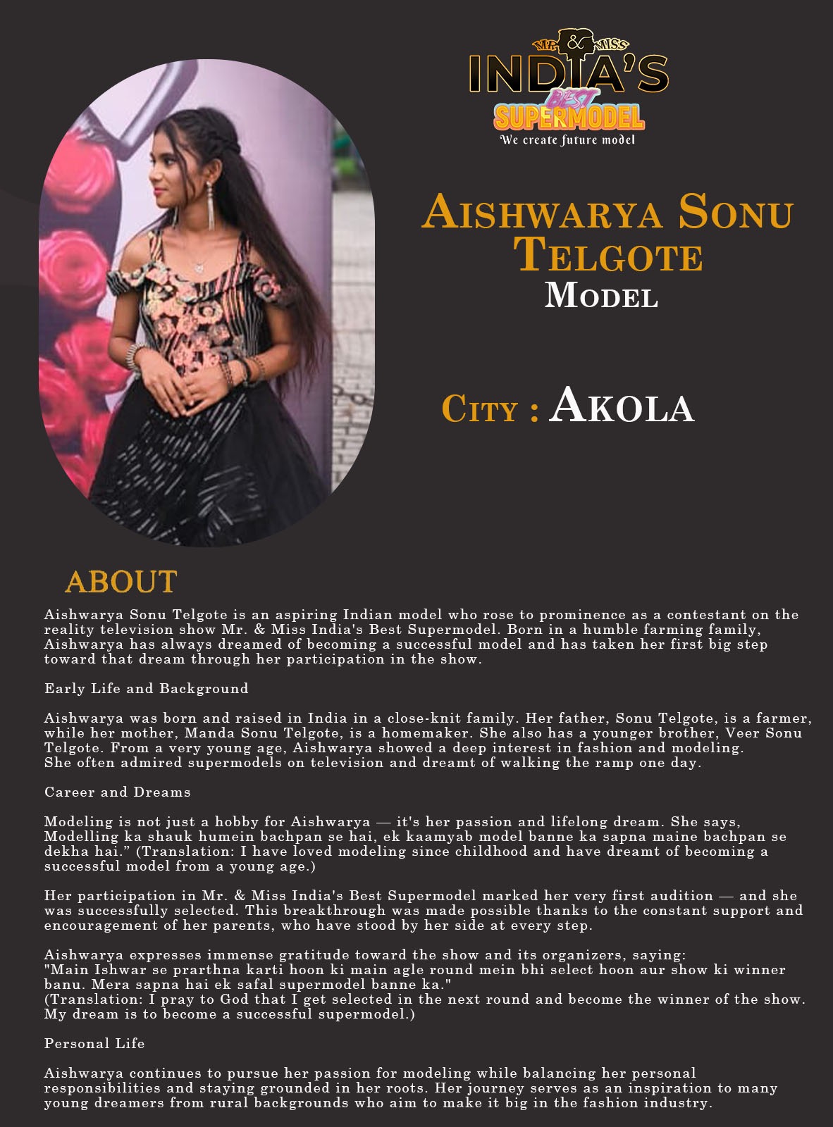 ITF Model Aishwarya Sonu Telgote AkolaAishwarya Sonu Telgote is an aspiring Indian model who rose to prominence as a contestant on the reality television show Mr. & Miss India’s Best Supermodel. Born in a humble farming family, Aishwarya has always dreamed of becoming a successful model and has taken her first big step toward that dream through her participation in the show.Early Life and BackgroundAishwarya was born and raised in India in a close-knit family.