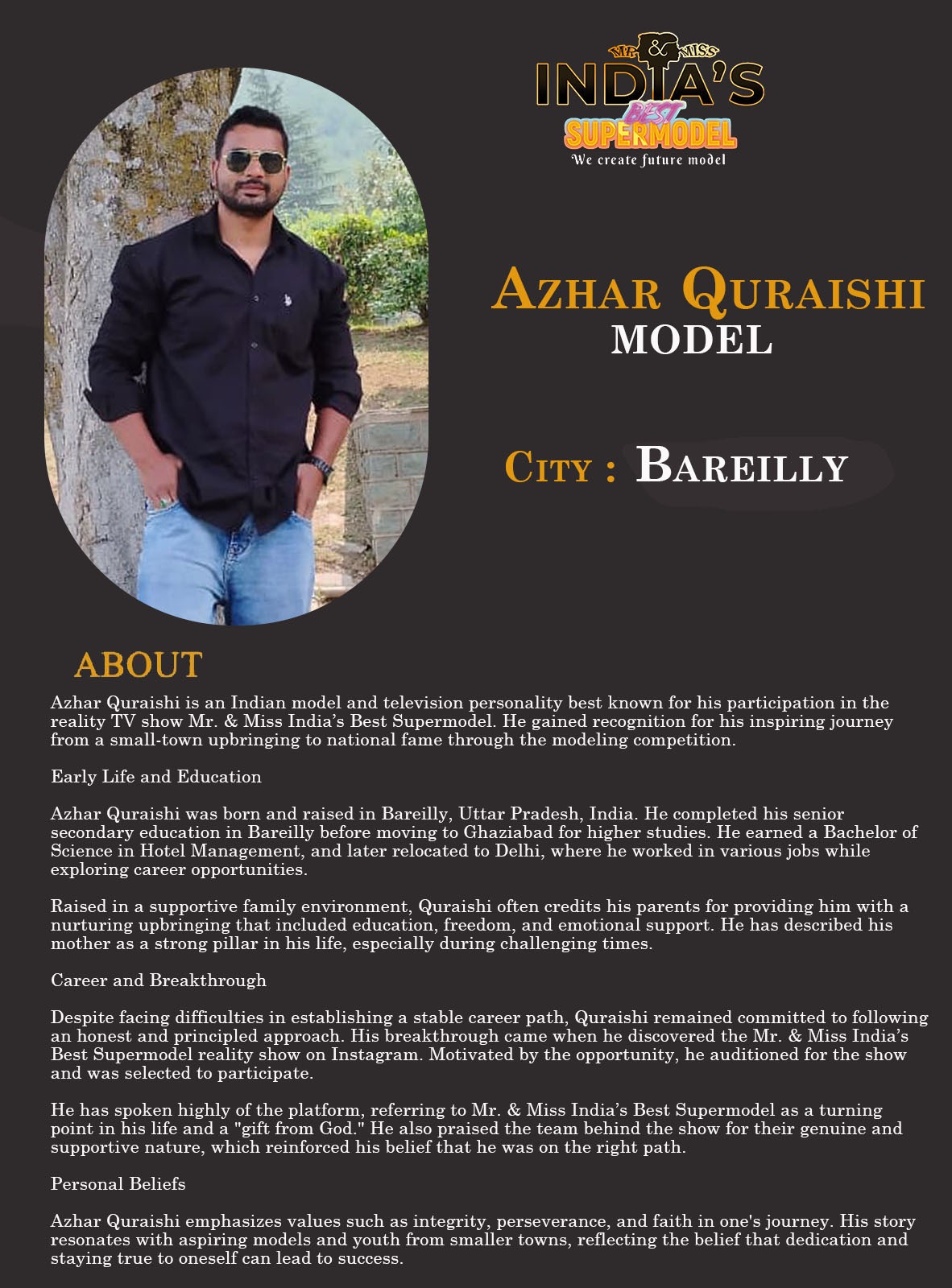 ITF Model Azhar Quraishi BareillyAzhar Quraishi is an Indian model and television personality best known for his participation in the reality TV show Mr. & Miss India’s Best Supermodel. He gained recognition for his inspiring journey from a small-town upbringing to national fame through the modeling competition.Early Life and EducationAzhar Quraishi was born and raised in Bareilly, Uttar Pradesh, India. He completed his senior secondary education in Bareilly before moving to Ghaziabad for higher studies.