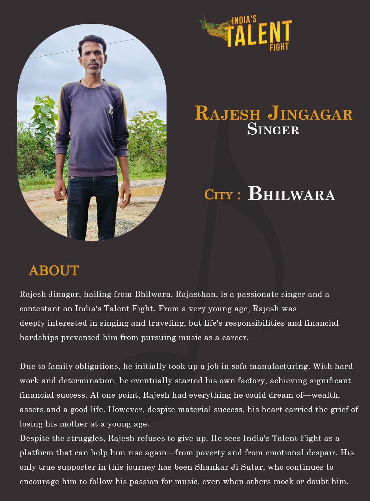 ITF Singer Rajesh Jinaghar BhilwaraRajesh Jinagar, hailing from Bhilwara, Rajasthan, is a passionate singer and a contestant on India’s Talent Fight. From a very young age, Rajesh was deeply interested in singing and traveling, but life’s responsibilities and financial hardships prevented him from pursuing music as a career.Due to family obligations, he initially took up a job in sofa manufacturing. With hard work and determination, he eventually started his own factory, achieving significant financial success.