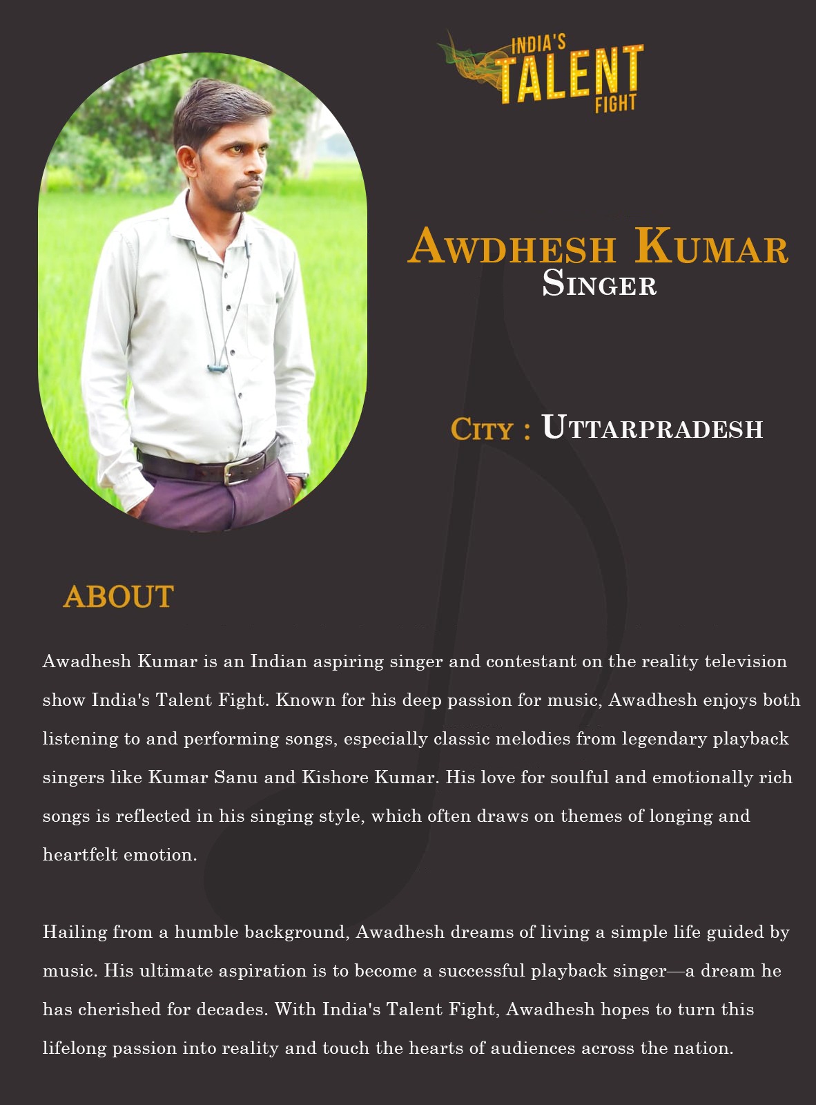 ITF Singer Awdhesh Kumar UttarpradeshAwadhesh Kumar is an Indian aspiring singer and contestant on the reality television show India’s Talent Fight. Known for his deep passion for music, Awadhesh enjoys both listening to and performing songs, especially classic melodies from legendary playback singers like Kumar Sanu and Kishore Kumar. His love for soulful and emotionally rich songs is reflected in his singing style, which often draws on themes of longing and heartfelt emotion.Hailing from a