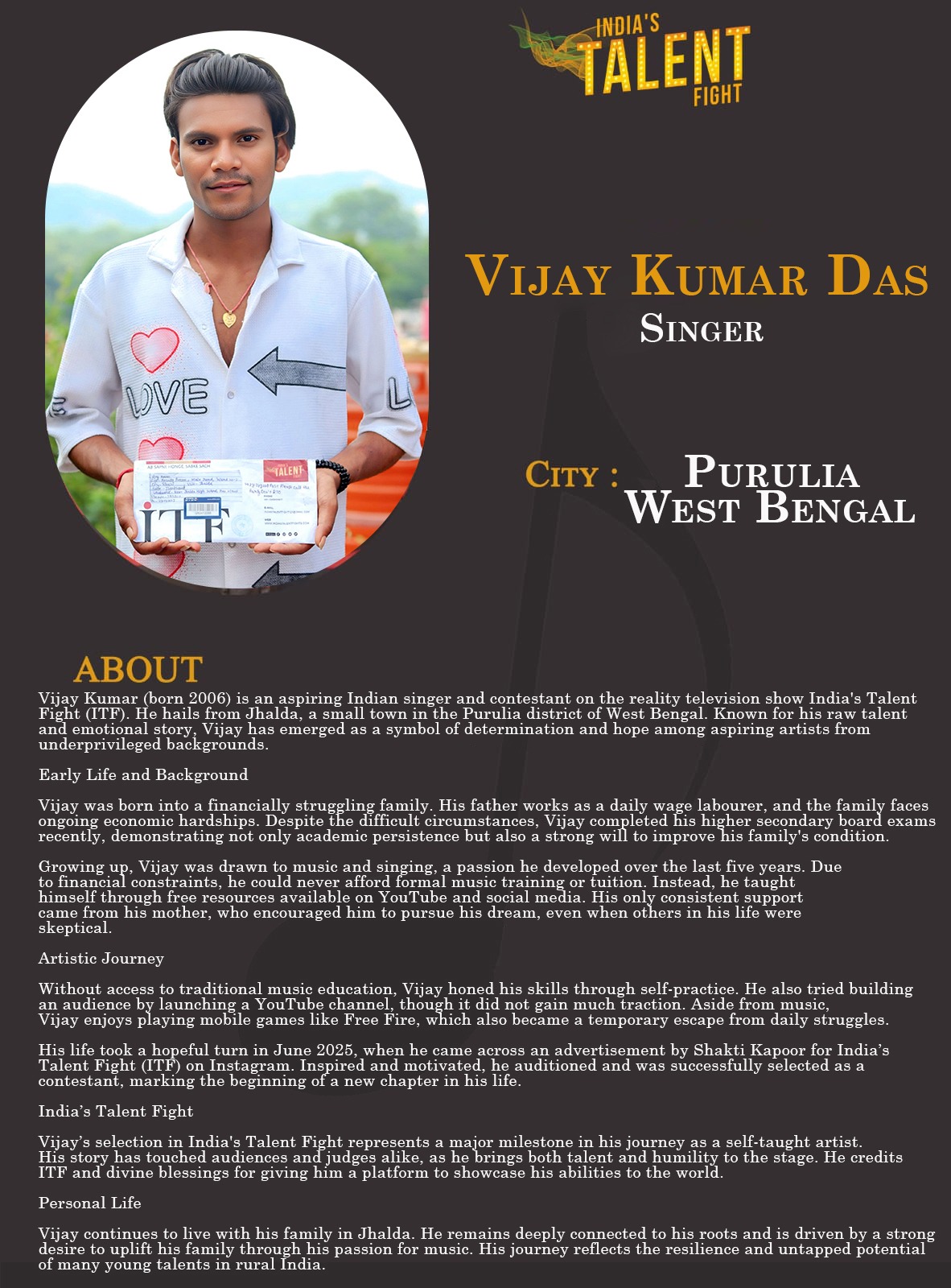 ITF Singer Vijay Kumar Das Purulia West BengalVijay Kumar Das(born 2006) is an aspiring Indian singer and contestant on the reality television show India’s Talent Fight (ITF). He hails from Jhalda, a small town in the Purulia district of West Bengal. Known for his raw talent and emotional story, Vijay has emerged as a symbol of determination and hope among aspiring artists from underprivileged backgrounds.Early Life and BackgroundVijay was born into a financially struggling family.