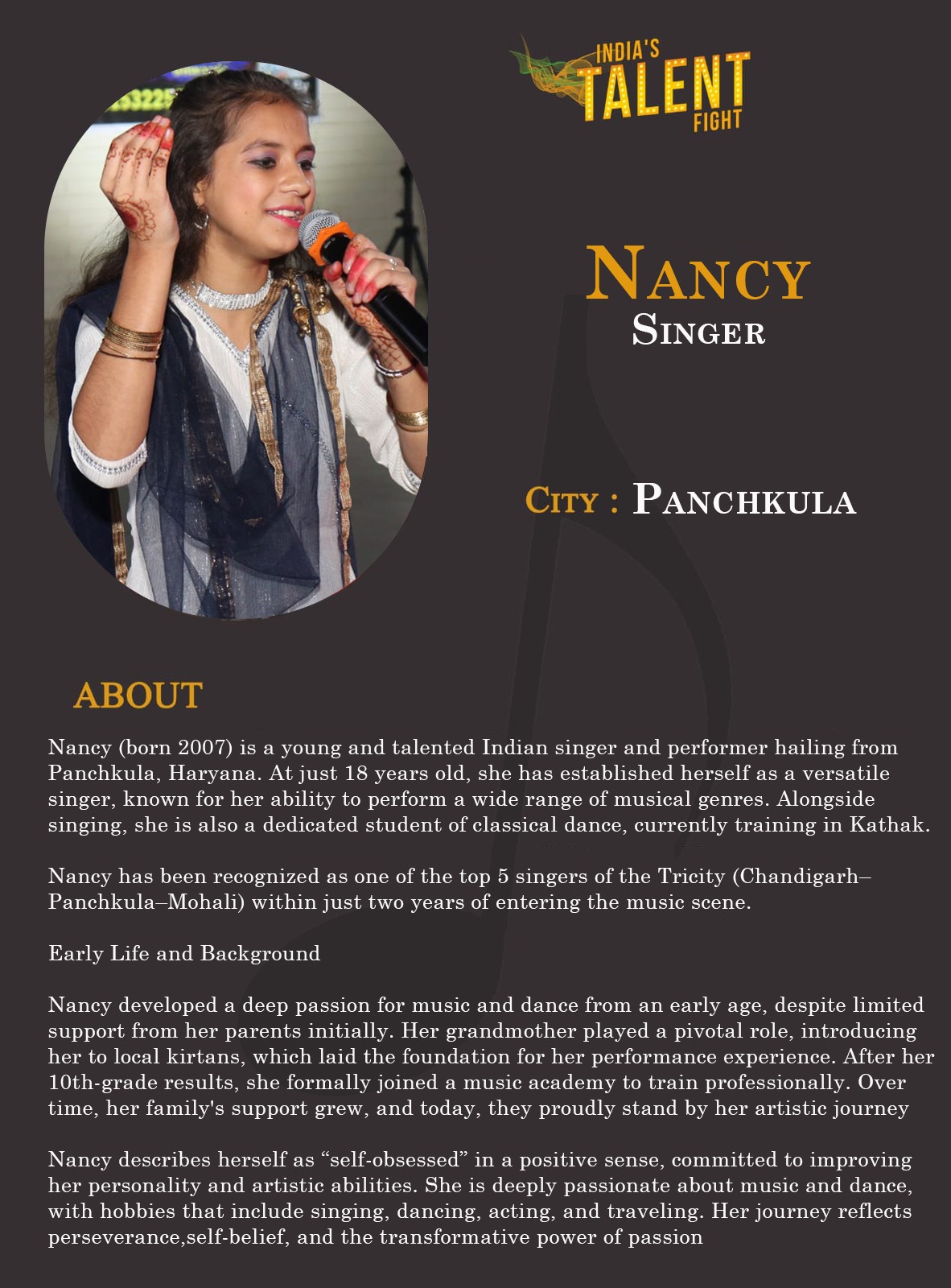 ITF Singer Nancy PanchkulaNancy (born 2007) is a young and talented Indian singer and performer hailing from Panchkula, Haryana. At just 18 years old, she has established herself as a versatile singer, known for her ability to perform a wide range of musical genres. Alongside singing, she is also a dedicated student of classical dance, currently training in Kathak.Nancy has been recognized as one of the top 5 singers of the Tricity (Chandigarh–Panchkula–Mohali) within just