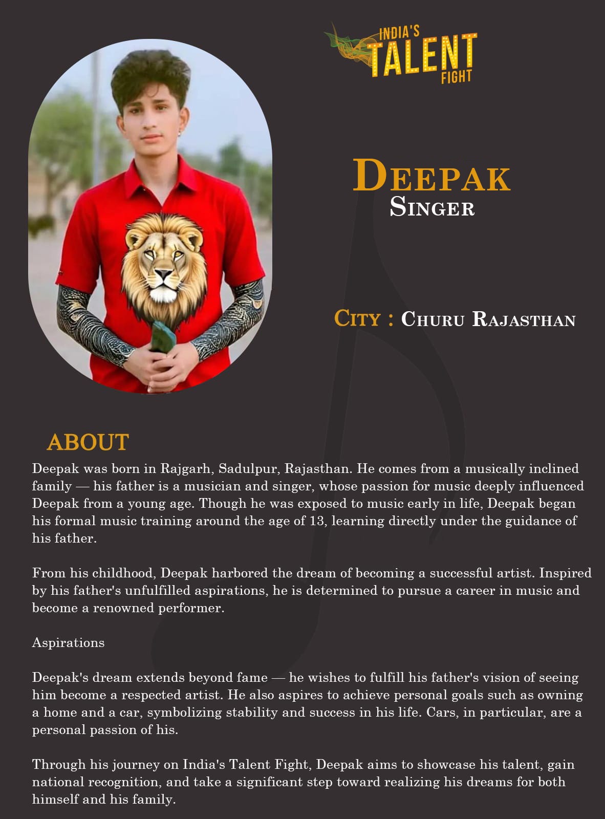 ITF Singer Deepak Churu RajasthanDeepak was born in Rajgarh, Sadulpur, Rajasthan. He comes from a musically inclined family — his father is a musician and singer, whose passion for music deeply influenced Deepak from a young age. Though he was exposed to music early in life, Deepak began his formal music training around the age of 13, learning directly under the guidance of his father.From his childhood, Deepak harbored the dream of becoming a successful