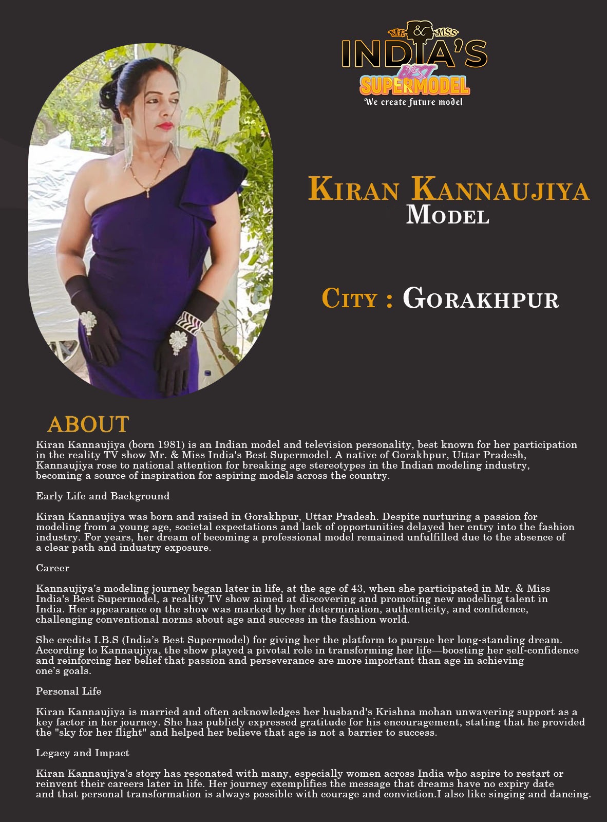 ITF Model Kiran Kannaujiya GorakhpurKiran Kannaujiya (born 1981) is an Indian model and television personality, best known for her participation in the reality TV show Mr. & Miss India’s Best Supermodel. A native of Gorakhpur, Uttar Pradesh, Kannaujiya rose to national attention for breaking age stereotypes in the Indian modeling industry, becoming a source of inspiration for aspiring models across the country.Early Life and BackgroundKiran Kannaujiya was born and raised in Gorakhpur, Uttar Pradesh. Despite