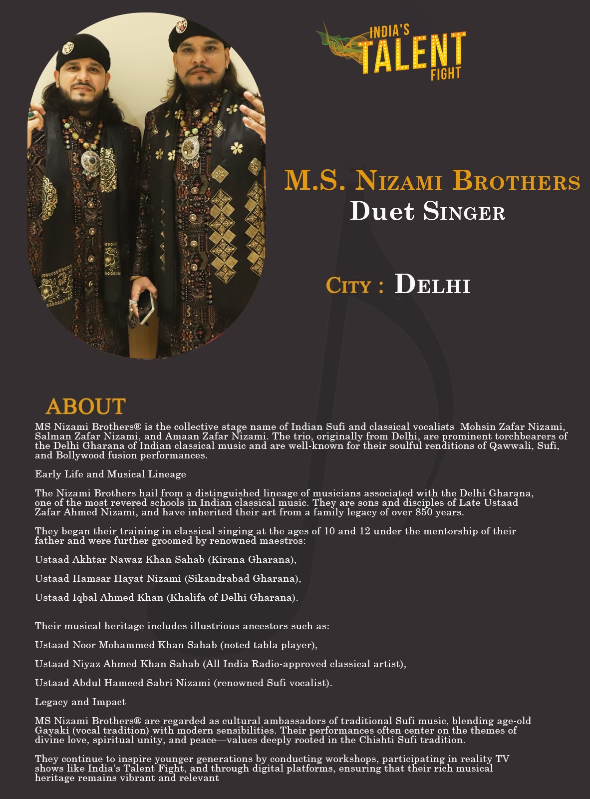 ITF Duet Singer M.S. Nizami Brothers DelhiMS Nizami Brothers® is the collective stage name of Indian Sufi and classical vocalists Mohsin Zafar Nizami, Salman Zafar Nizami, and Amaan Zafar Nizami. The trio, originally from Delhi, are prominent torchbearers of the Delhi Gharana of Indian classical music and are well-known for their soulful renditions of Qawwali, Sufi, and Bollywood fusion performances.Early Life and Musical LineageThe Nizami Brothers hail from a distinguished lineage of musicians associated with