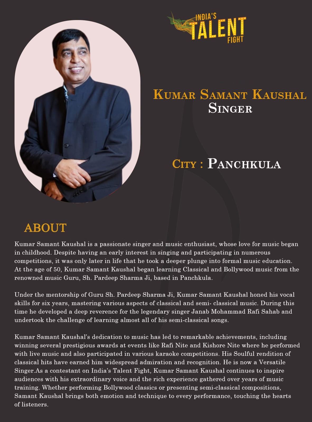ITF Singer Kumar Samant KaushalKumar Samant Kaushal is a passionate singer and music enthusiast, whose love for music began in childhood. Despite having an early interest in singing and participating in numerous competitions, it was only later in life that he took a deeper plunge into formal music education. At the age of 50, Kumar Samant Kaushal began learning Classical and Bollywood music from the renowned music Guru, Sh. Pardeep Sharma Ji, based in Panchkula.Under