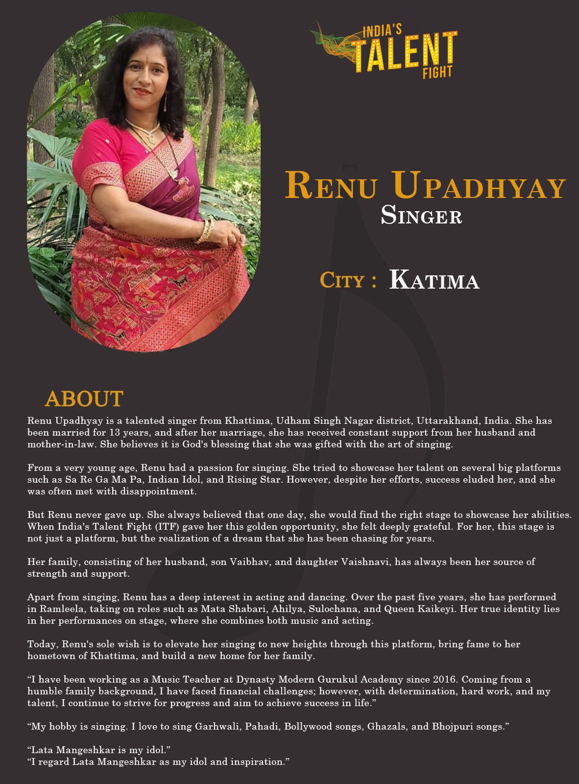 ITF Singer Renu Upadhyay KatimaRenu Upadhyay is a talented singer from Khattima, Udham Singh Nagar district, Uttarakhand, India. She has been married for 13 years, and after her marriage, she has received constant support from her husband and mother-in-law. She believes it is God’s blessing that she was gifted with the art of singing.From a very young age, Renu had a passion for singing. She tried to showcase her talent on several big platforms such