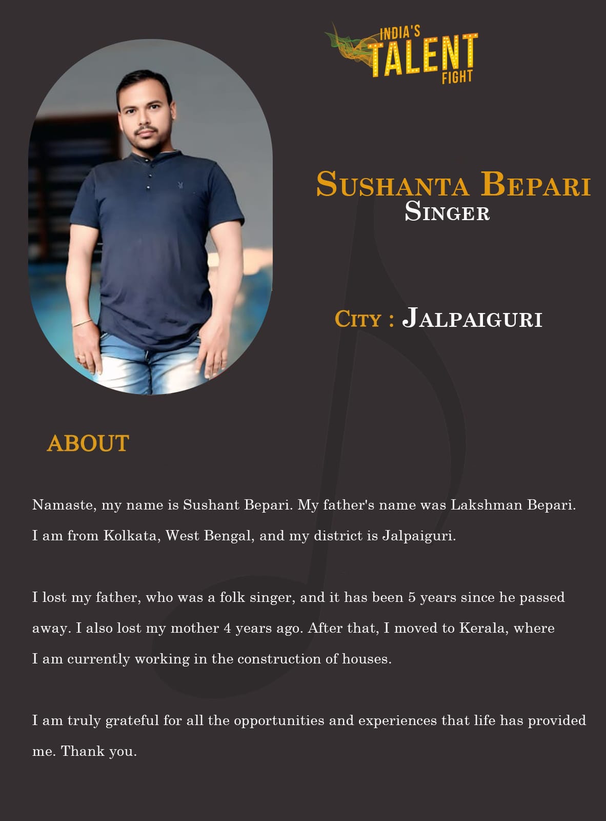 ITF Singer Sushanta Bepari JalpaiguriNamaste, my name is Sushant Bepari. My father’s name was Lakshman Bepari. I am from Kolkata, West Bengal, and my district is Jalpaiguri.I lost my father, who was a folk singer, and it has been 5 years since he passed away. I also lost my mother 4 years ago. After that, I moved to Kerala, where I am currently working in the construction of houses.I am truly grateful for all the