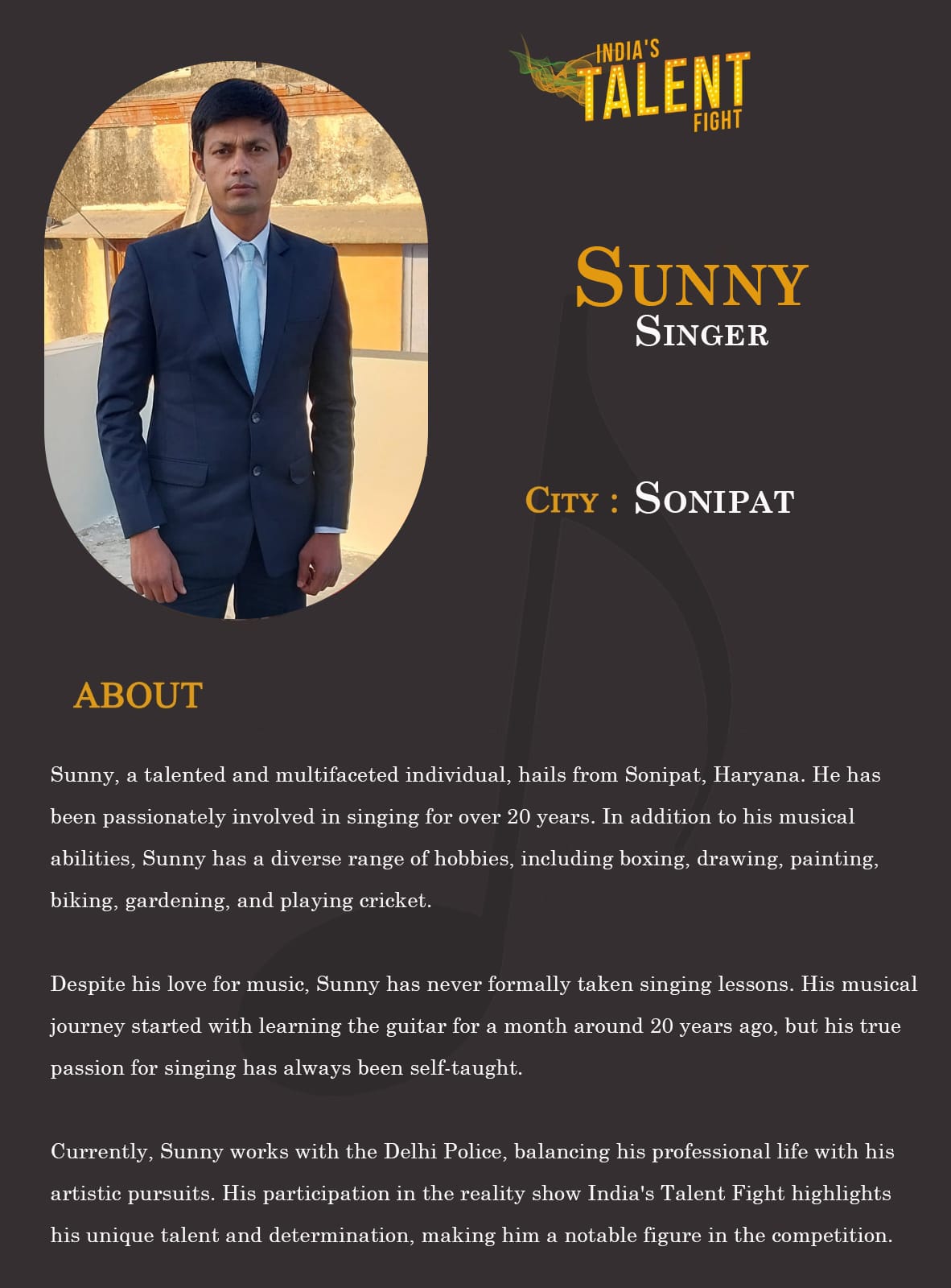 ITF Singer Sunny SonipatSunny, a talented and multifaceted individual, hails from Sonipat, Haryana. He has been passionately involved in singing for over 20 years. In addition to his musical abilities, Sunny has a diverse range of hobbies, including boxing, drawing, painting, biking, gardening, and playing cricket.Despite his love for music, Sunny has never formally taken singing lessons. His musical journey started with learning the guitar for a month around 20 years ago, but his true