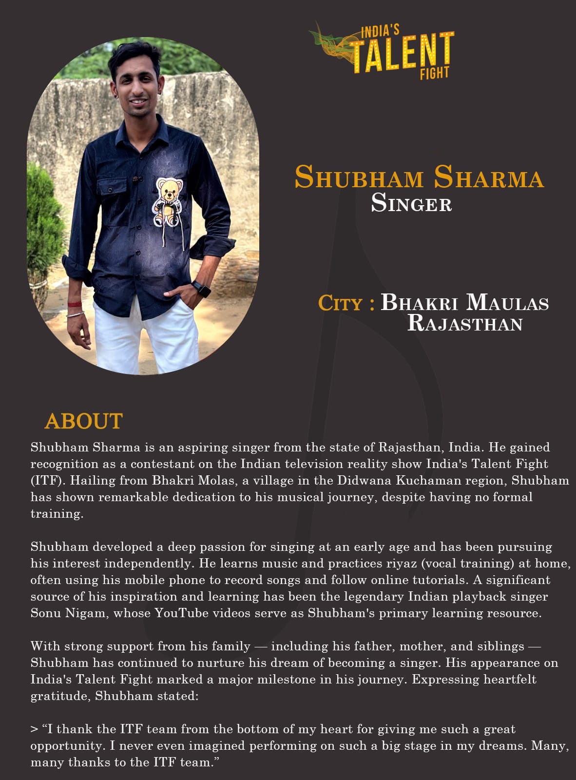 ITF Singer Shubham Sharma RajasthanShubham Sharma is an aspiring singer from the state of Rajasthan, India. He gained recognition as a contestant on the Indian television reality show India’s Talent Fight (ITF). Hailing from Bhakri Molas, a village in the Didwana Kuchaman region, Shubham has shown remarkable dedication to his musical journey, despite having no formal training.Shubham developed a deep passion for singing at an early age and has been pursuing his interest independently. He