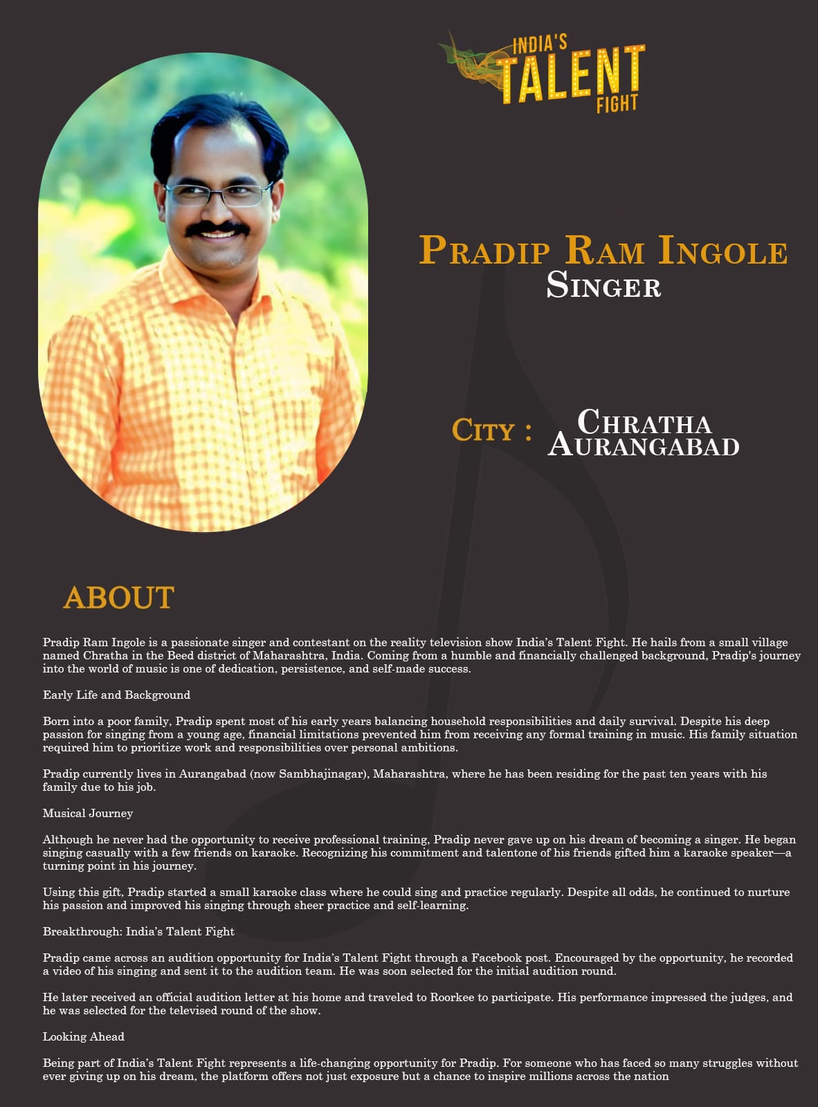 ITF Singer Pradip Ram Ingole Chratha AurangabadPradip Ram Ingole is a passionate singer and contestant on the reality television show India’s Talent Fight. He hails from a small village named Chratha in the Beed district of Maharashtra, India. Coming from a humble and financially challenged background, Pradip’s journey into the world of music is one of dedication, persistence, and self-made success.Early Life and BackgroundBorn into a poor family, Pradip spent most of his early years
