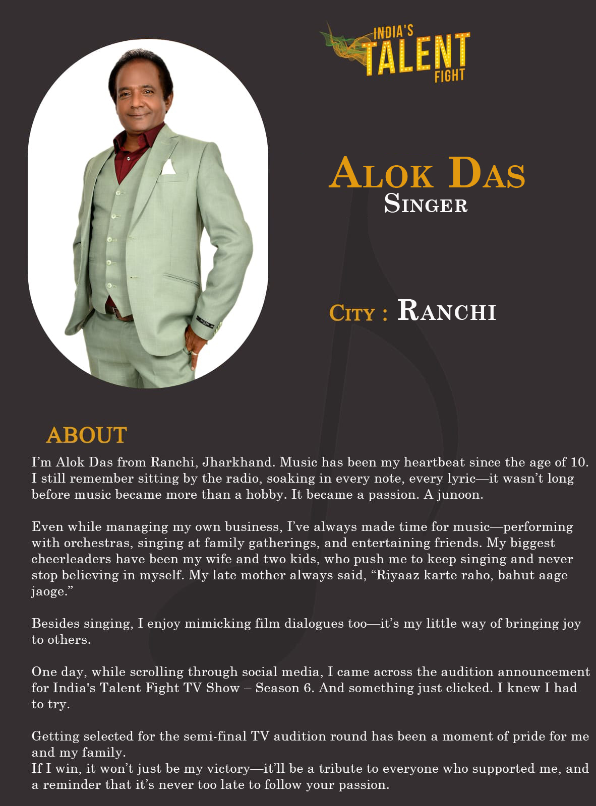 ITF Singer Alok Das RanchiI’m Alok Das from Ranchi, Jharkhand. Music has been my heartbeat since the age of 10.I still remember sitting by the radio, soaking in every note, every lyric—it wasn’t long before music became more than a hobby. It became a passion. A junoon.Even while managing my own business, I’ve always made time for music—performing with orchestras, singing at family gatherings, and entertaining friends. My biggest cheerleaders have been my wife and