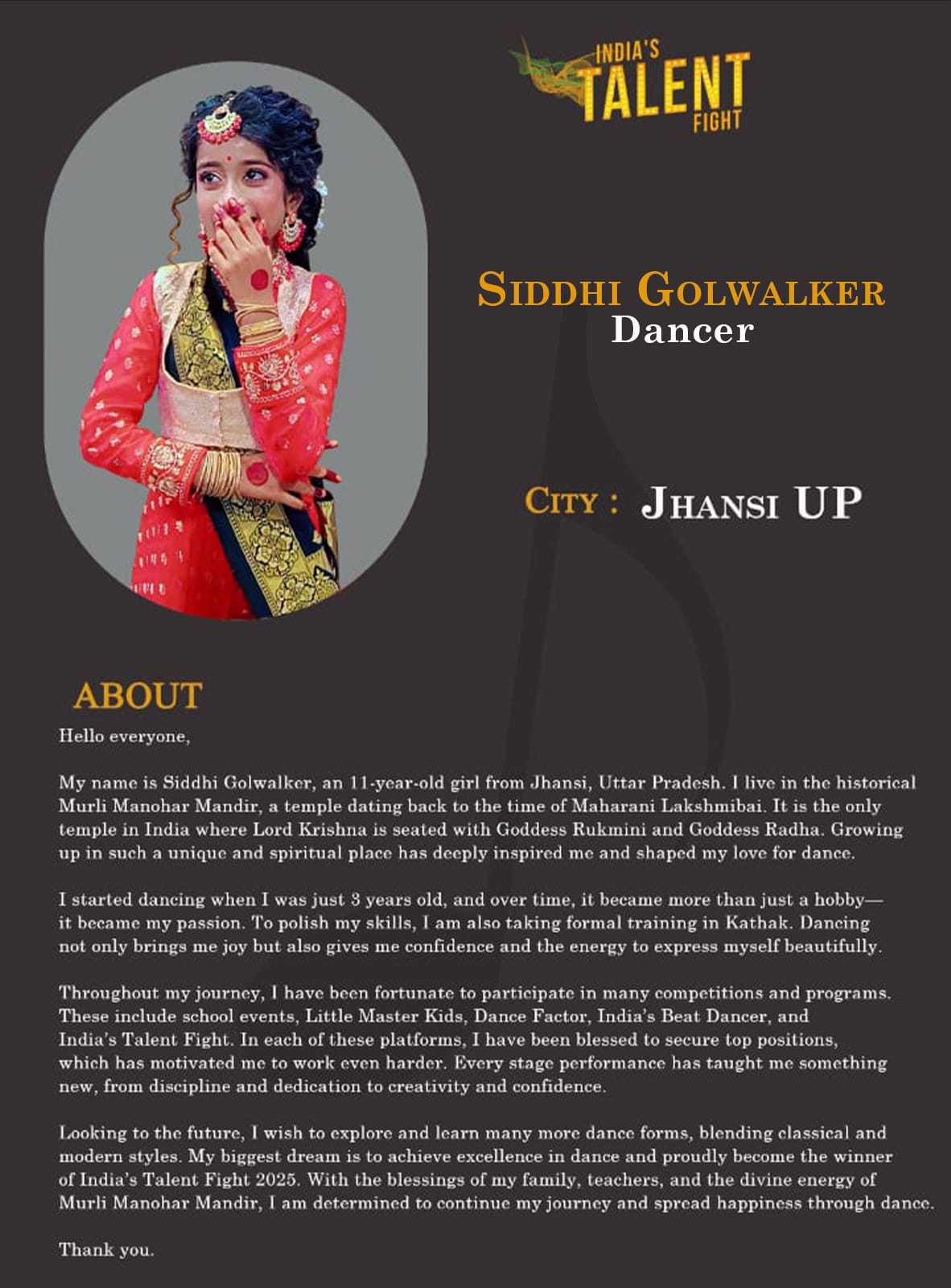 ITF Dancer Siddhi Golwalker Jhansi UPMy name is Siddhi Golwalker, an 11-year-old girl from Jhansi, Uttar Pradesh. I live in the historical Murli Manohar Mandir, a temple dating back to the time of Maharani Lakshmibai. It is the only temple in India where Lord Krishna is seated with Goddess Rukmini and Goddess Radha. Growing up in such a unique and spiritual place has deeply inspired me and shaped my love for dance.I started dancing when I was just 3 years old, and