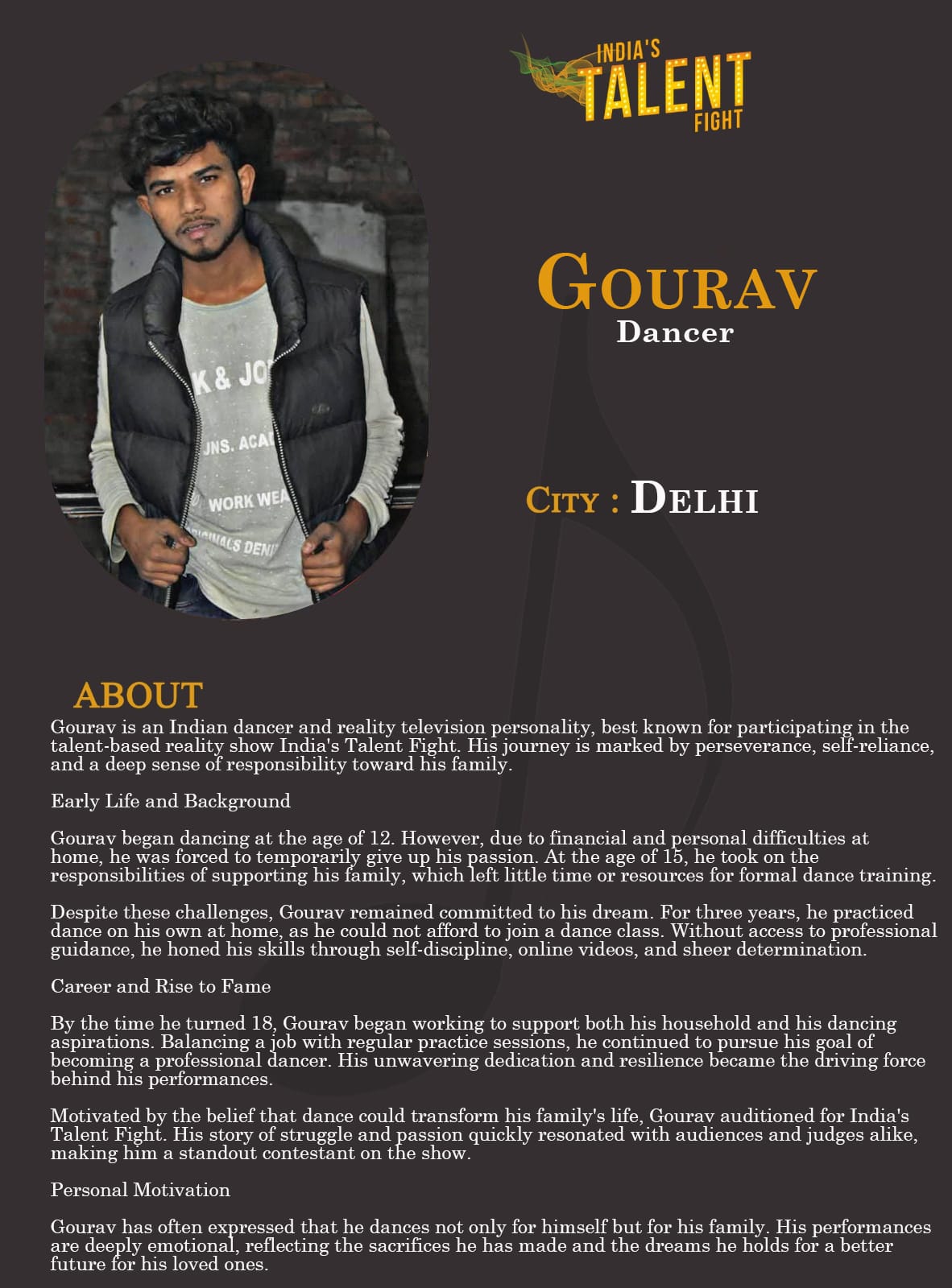 ITF Dancer Gourav DelhiGourav is an Indian dancer and reality television personality, best known for participating in the talent-based reality show India’s Talent Fight. His journey is marked by perseverance, self-reliance, and a deep sense of responsibility toward his family.Early Life and BackgroundGourav began dancing at the age of 12. However, due to financial and personal difficulties at home, he was forced to temporarily give up his passion. At the age of 15, he took