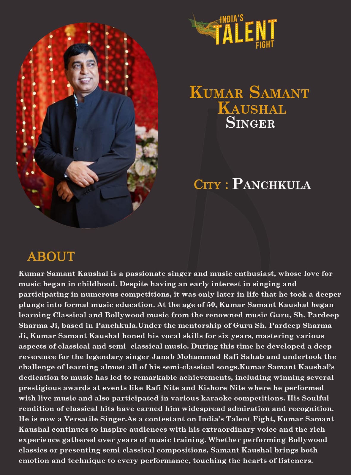 ITF Singer Kumar Samant Kaushal PanchkulaKumar Samant Kaushal is a passionate singer and music enthusiast, whose love for music began in childhood. Despite having an early interest in singing and participating in numerous competitions, it was only later in life that he took a deeper plunge into formal music education. At the age of 50, Kumar Samant Kaushal began learning Classical and Bollywood music from the renowned music Guru, Sh. Pardeep Sharma Ji, based in