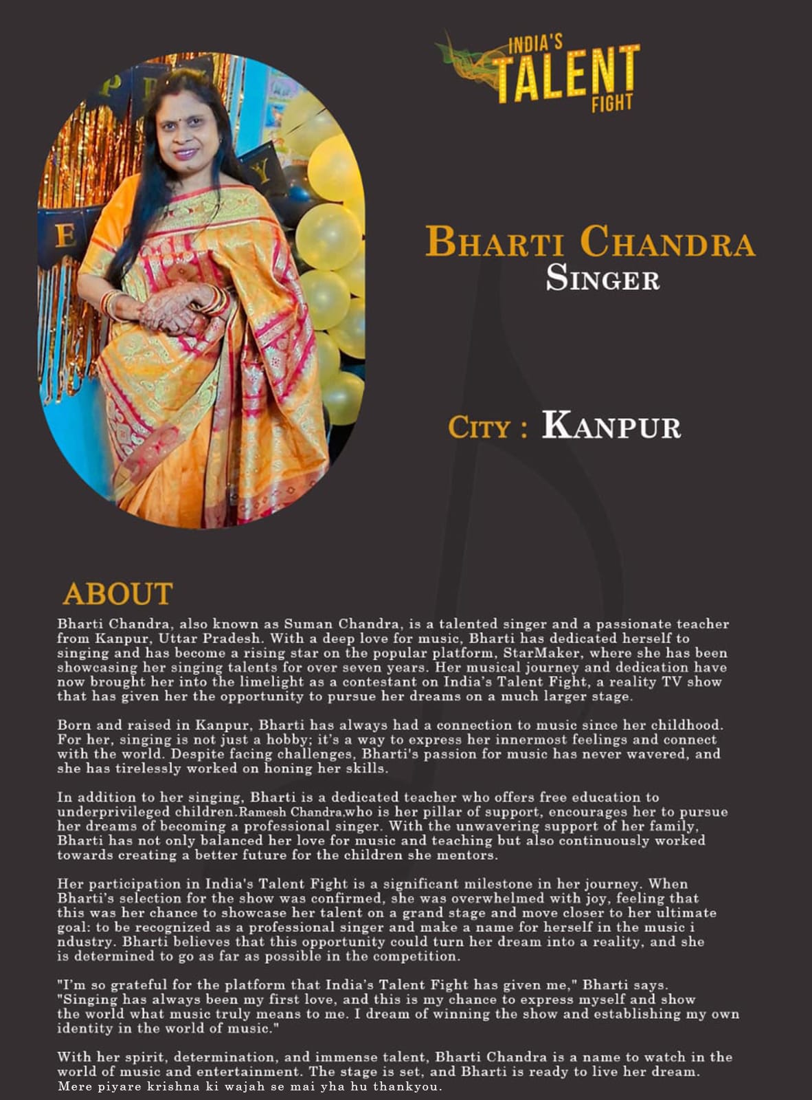 ITF Singer Bharti Chandra kanpurBharti Chandra, also known as Suman Chandra, is a talented singer and a passionate teacher from Kanpur, Uttar Pradesh. With a deep love for music, Bharti has dedicated herself to singing and has become a rising star on the popular platform, StarMaker, where she has been showcasing her singing talents for over seven years. Her musical journey and dedication have now brought her into the limelight as a contestant on India’s