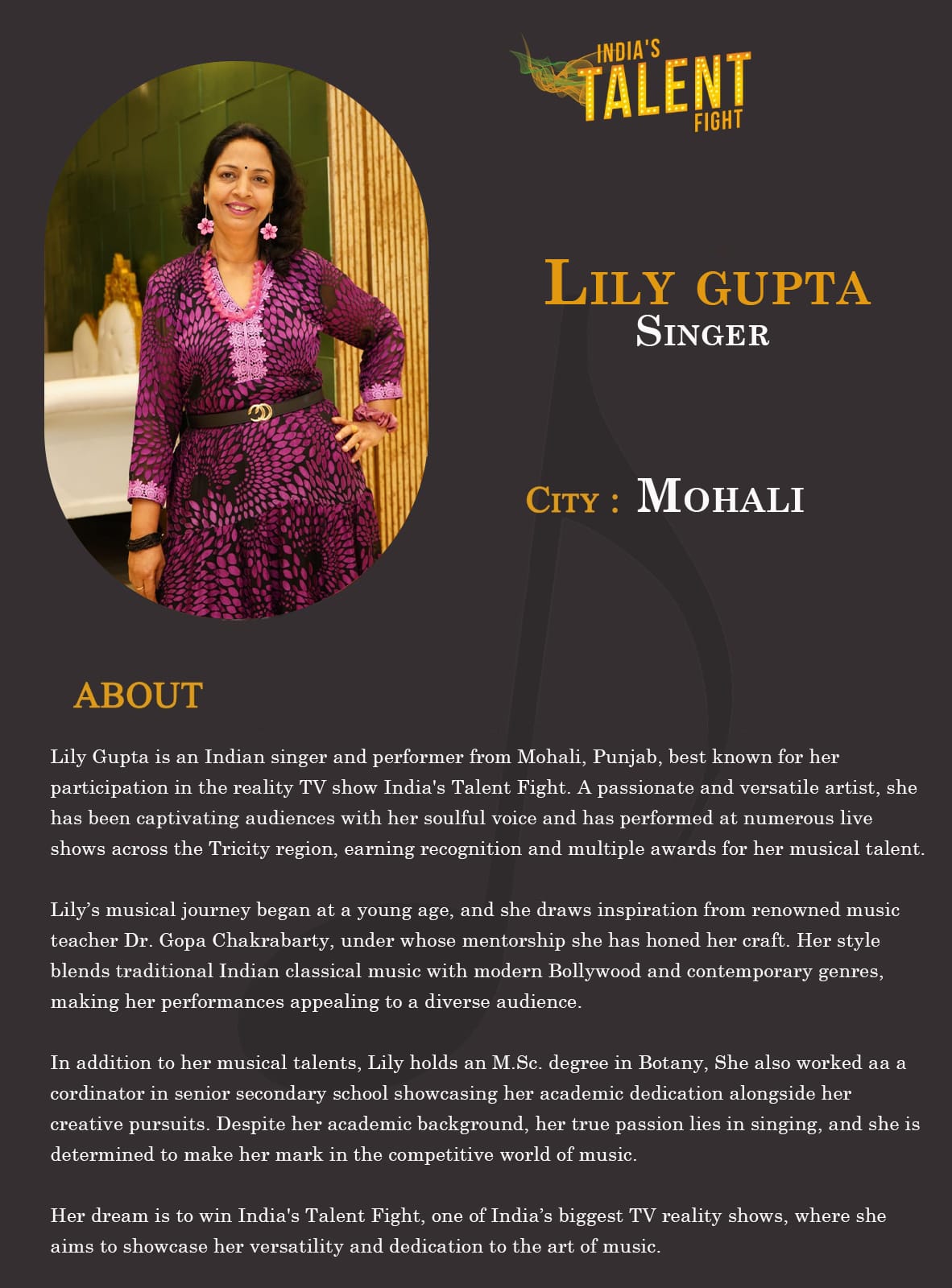 ITF Singer Lily gupta MohaliLily Gupta is an Indian singer and performer from Mohali, Punjab, best known for her participation in the reality TV show India’s Talent Fight. A passionate and versatile artist, she has been captivating audiences with her soulful voice and has performed at numerous live shows across the Tricity region, earning recognition and multiple awards for her musical talent.Lily’s musical journey began at a young age, and she draws inspiration from renowned
