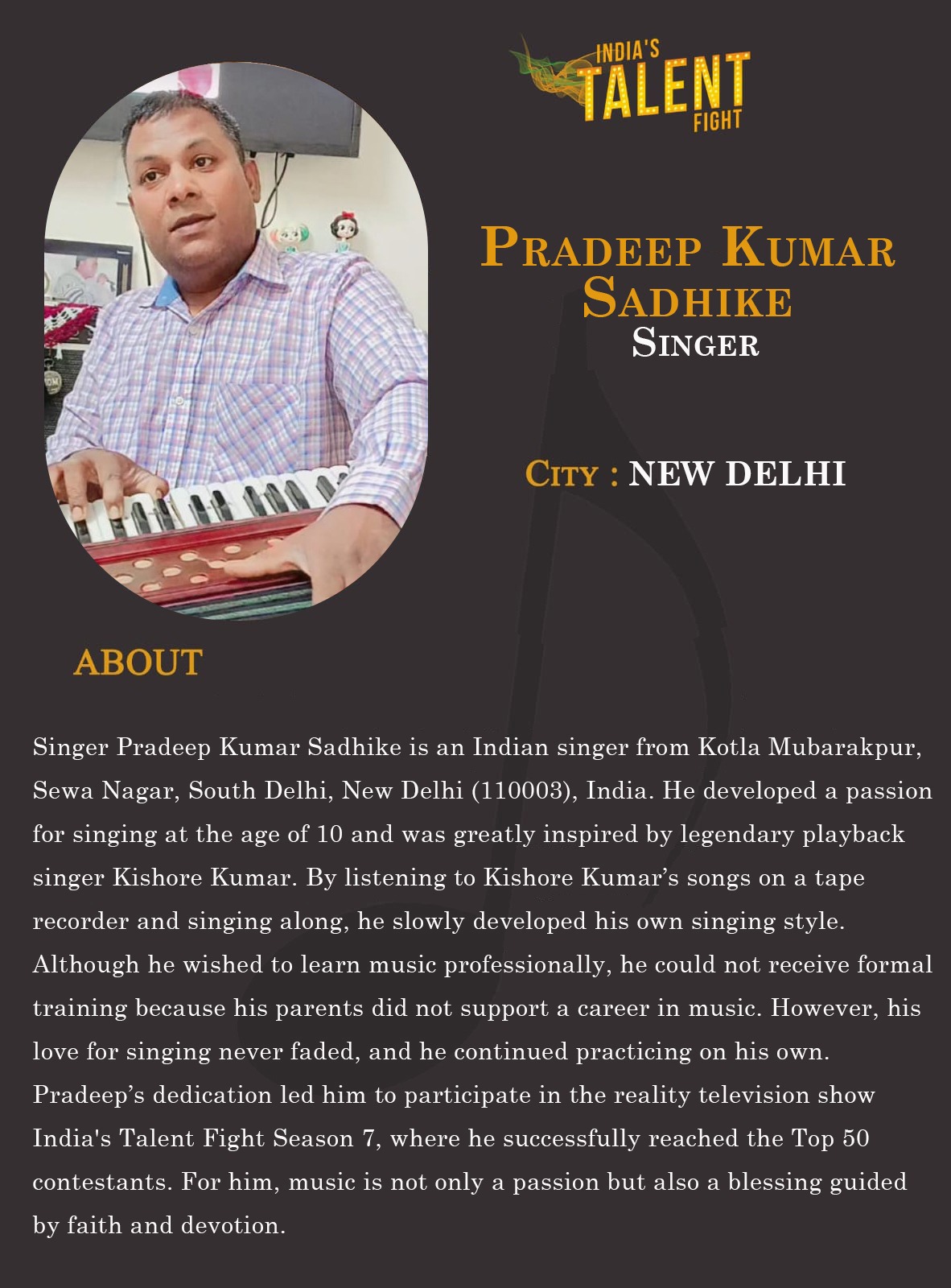 ITF Singer pradeep Kumar sadhike New DelhiSinger Pradeep Kumar Sadhike is an Indian singer from Kotla Mubarakpur, Sewa Nagar, South Delhi, New Delhi (110003), India. He developed a passion for singing at the age of 10 and was greatly inspired by legendary playback singer Kishore Kumar. By listening to Kishore Kumar’s songs on a tape recorder and singing along, he slowly developed his own singing style.Although he wished to learn music professionally, he could not