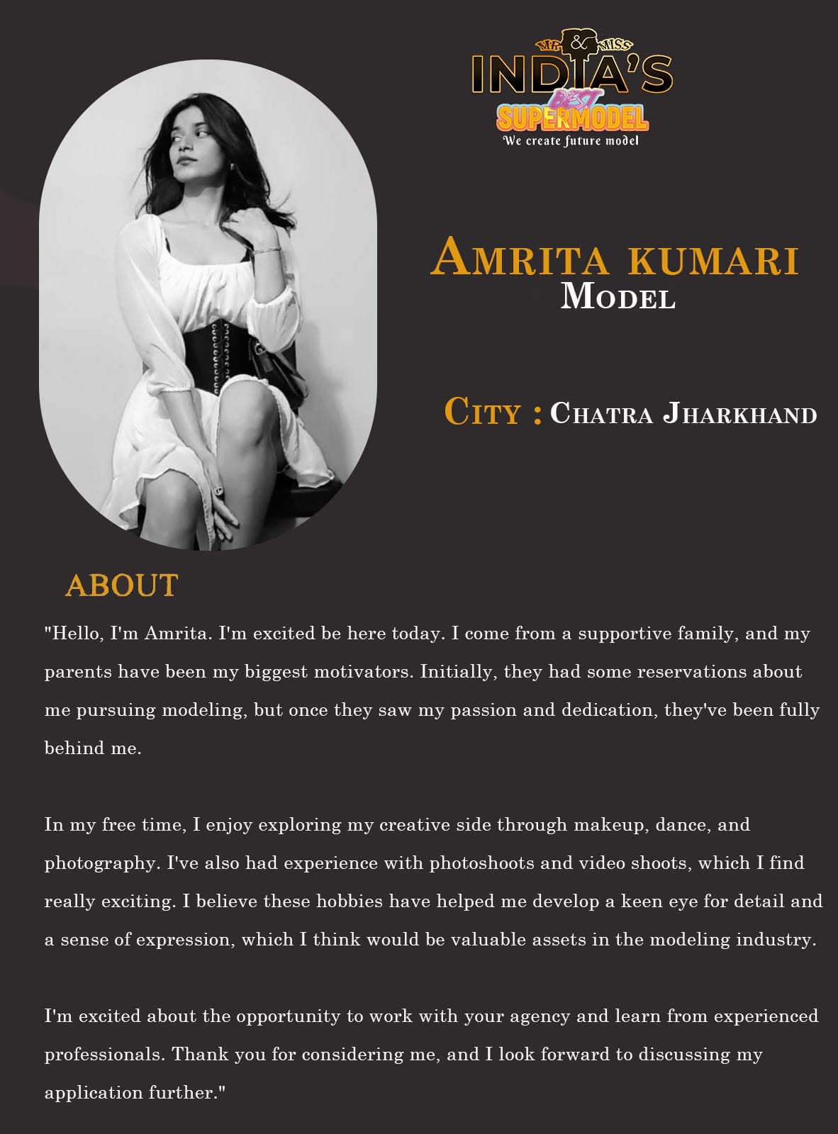 ITF Model Amrita kumari Chatra Jharkhand“Hello, I’m Amrita. I’m excited be here today. I come from a supportive family, and my parents have been my biggest motivators. Initially, they had some reservations about me pursuing modeling, but once they saw my passion and dedication, they’ve been fully behind me.In my free time, I enjoy exploring my creative side through makeup, dance, and photography. I’ve also had experience with photoshoots and video shoots, which I find
