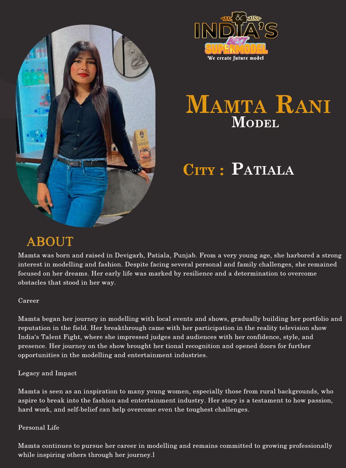 ITF Model Mamta Rani PatialaMamta was born and raised in Devigarh, Patiala, Punjab. From a very young age, she harbored a strong interest in modelling and fashion. Despite facing several personal and family challenges, she remained focused on her dreams. Her early life was marked by resilience and a determination to overcome obstacles that stood in her way.CareerMamta began her journey in modelling with local events and shows, gradually building her portfolio and reputation in