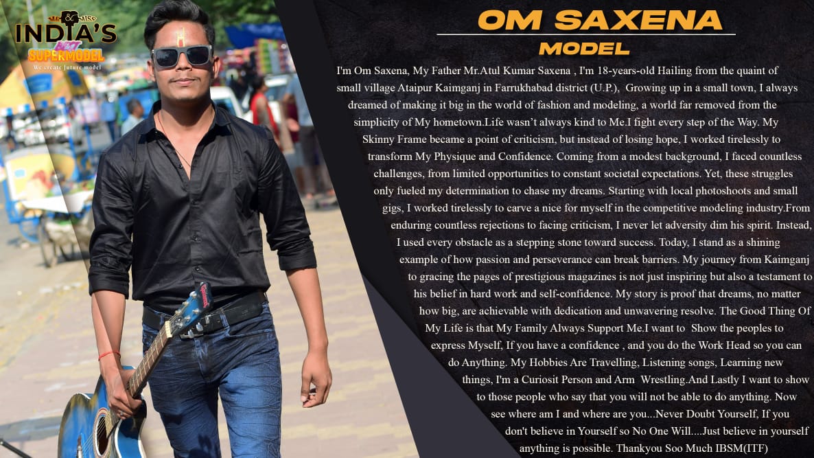 ITF Model Om Saxena KanpurI’m Om Saxena, My Father Mr.Atul Kumar Saxena , I’m 18-years-old Hailing from the quaint of small village Ataipur Kaimganj in Farrukhabad district (U.P.), Growing up in a small town, I always dreamed of making it big in the world of fashion and modeling, a world far removed from the simplicity of My hometown.Life wasn’t always kind to Me.I fight every step of the Way.My Skinny Frame became a point of