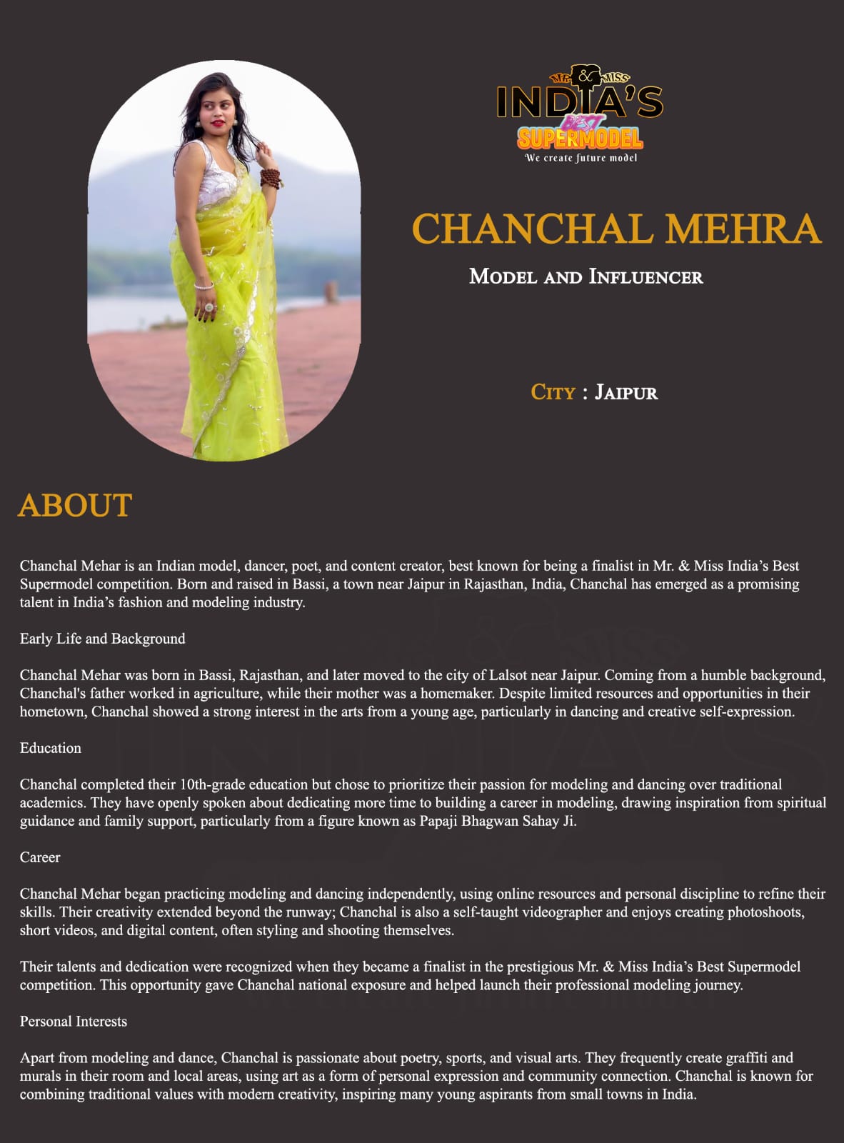 ITF Model Chanchal Mehra JaipurChanchal Mehar is an Indian model, dancer, poet, and content creator, best known for being a finalist in Mr. & Miss India’s Best Supermodel competition. Born and raised in Bassi, a town near Jaipur in Rajasthan, India, Chanchal has emerged as a promising talent in India’s fashion and modeling industry.Early Life and BackgroundChanchal Mehar was born in Bassi, Rajasthan, and later moved to the city of Lalsot near Jaipur. Coming from