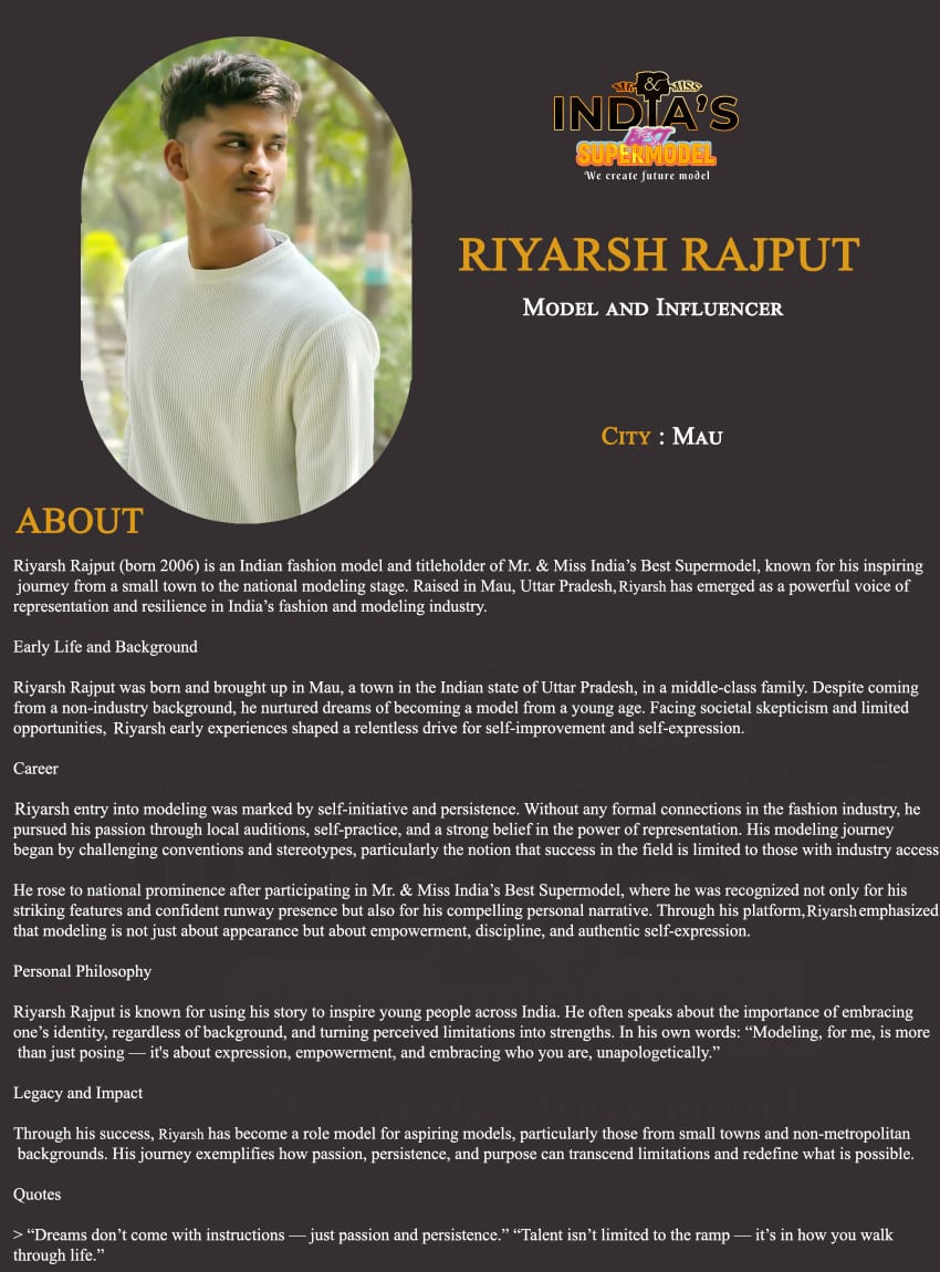 ITF Model Riyarsh Rajput MauRiyarsh Rajput (born 2005) is an Indian fashion model and titleholder of Mr. & Miss India’s Best Supermodel, known for his inspiring journey from a small town to the national modeling stage. Raised in Mau, Uttar Pradesh, Riyarsh has emerged as a powerful voice of representation and resilience in India’s fashion and modeling industry.Early Life and BackgroundRiyarsh Rajput was born and brought up in Mau, a town in the Indian state