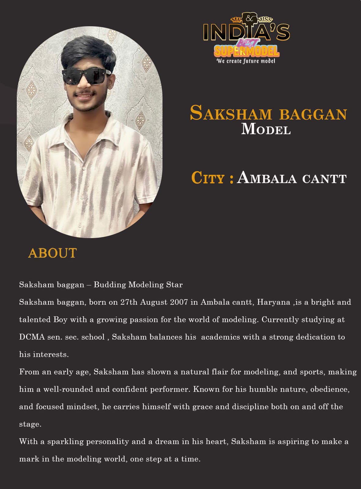 ITF Model Saksham baggan Ambala canttSaksham baggan – Budding Modeling StarSaksham baggan, born on 27th August 2007 in Ambala cantt, Haryana ,is a bright and talented Boy with a growing passion for the world of modeling. Currently studying at DCMA sen. sec. school , Saksham balances his academics with a strong dedication to his interests.From an early age, Saksham has shown a natural flair for modeling, and sports, making him a well-rounded and confident performer.