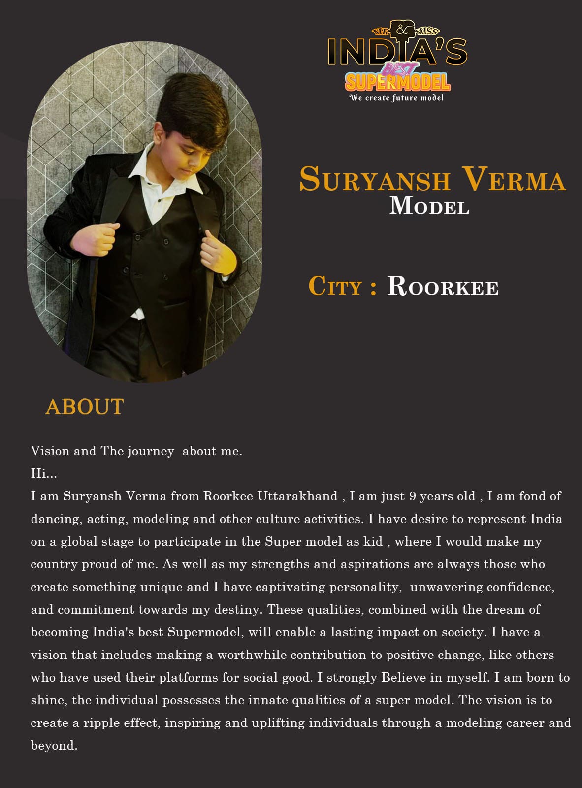 ITF Model Suryansh Verma RoorkeeHi…I am Suryansh Verma from Roorkee Uttarakhand , I am just 9 years old , I am fond of dancing, acting, modeling and other culture activities. I have desire to represent India on a global stage to participate in the Super model as kid , where I would make my country proud of me. As well as my strengths and aspirations are always those who create something unique and I have
