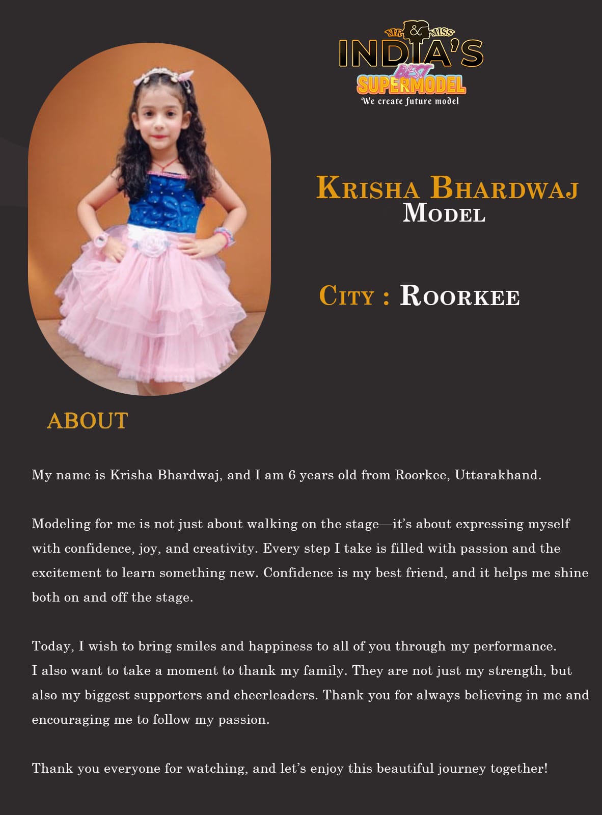 ITF Model Krisha Bhardwaj RoorkeeMy name is Krisha Bhardwaj, and I am 6 years old from Roorkee, Uttarakhand.Modeling for me is not just about walking on the stage—it’s about expressing myself with confidence, joy, and creativity. Every step I take is filled with passion and the excitement to learn something new. Confidence is my best friend, and it helps me shine both on and off the stage.Today, I wish to bring smiles and happiness to