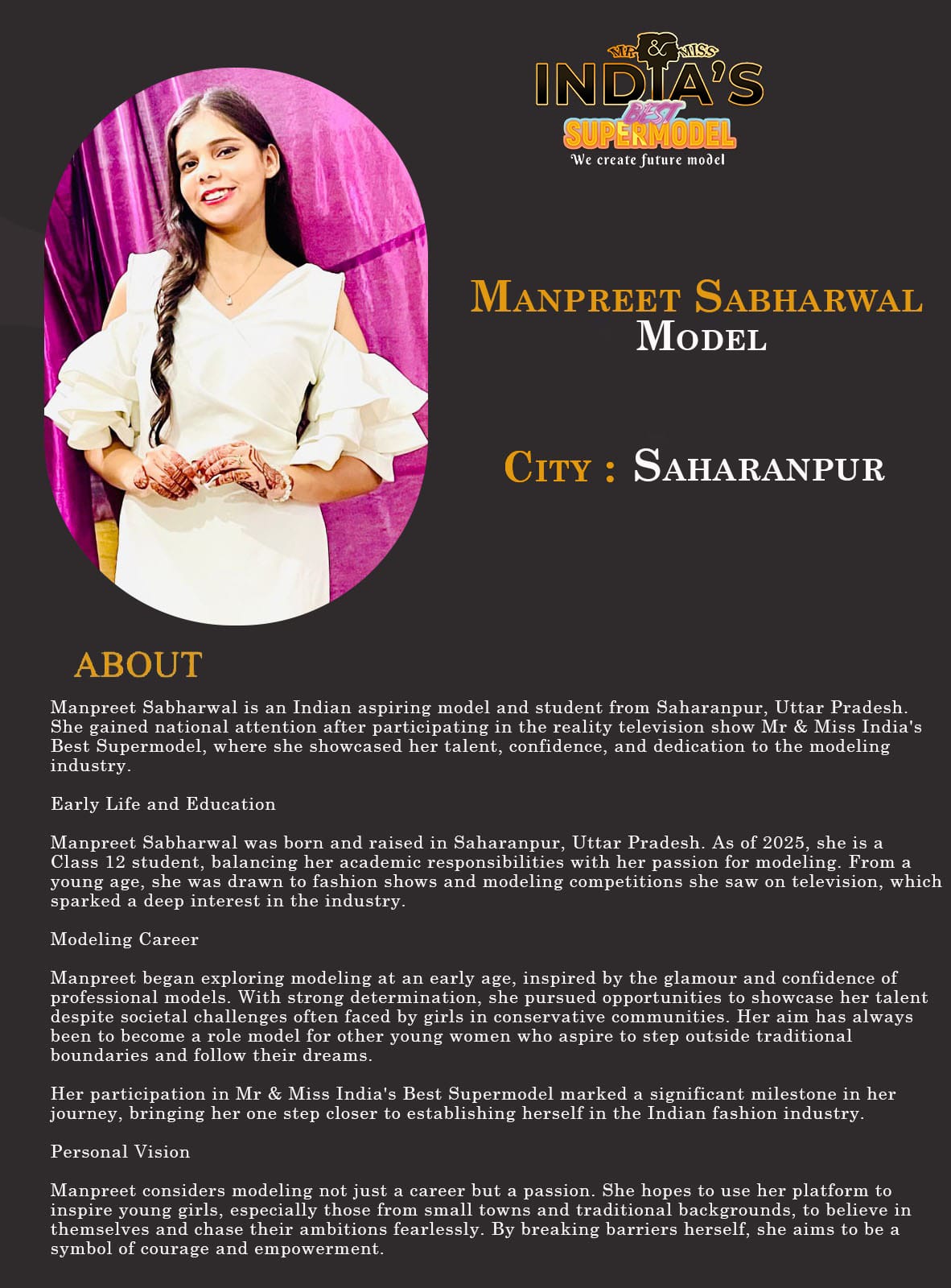 ITF Model Manpreet Sabharwal SaharanpurManpreet Sabharwal is an Indian aspiring model and student from Saharanpur, Uttar Pradesh. She gained national attention after participating in the reality television show Mr & Miss India’s Best Supermodel, where she showcased her talent, confidence, and dedication to the modeling industry.Early Life and EducationManpreet Sabharwal was born and raised in Saharanpur, Uttar Pradesh. As of 2025, she is a Class 12 student, balancing her academic responsibilities with her passion for