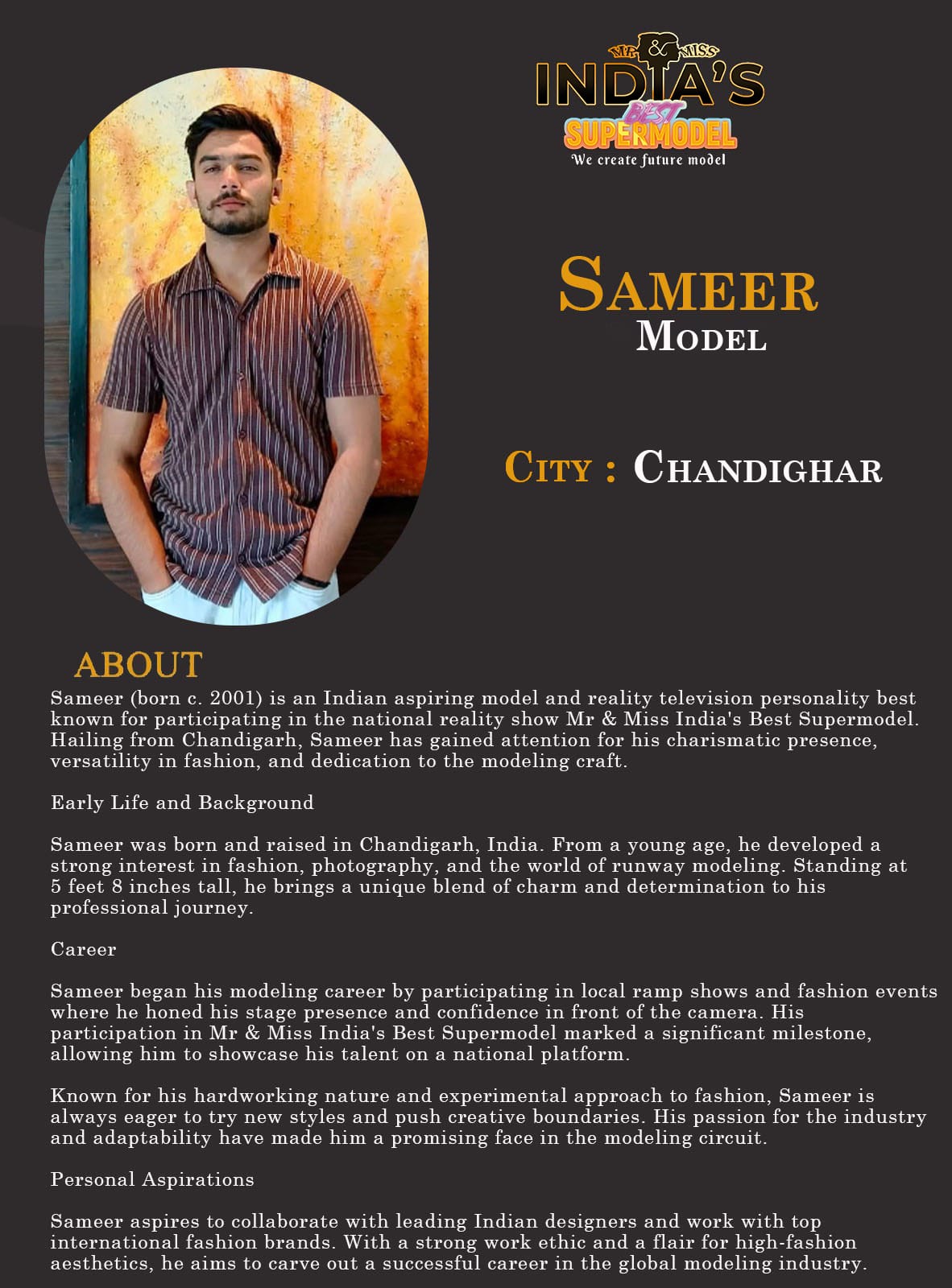 ITF Model Sameer ChandigarhSameer (born c. 2001) is an Indian aspiring model and reality television personality best known for participating in the national reality show Mr & Miss India’s Best Supermodel. Hailing from Chandigarh, Sameer has gained attention for his charismatic presence, versatility in fashion, and dedication to the modeling craft.Early Life and BackgroundSameer was born and raised in Chandigarh, India. From a young age, he developed a strong interest in fashion, photography, and the