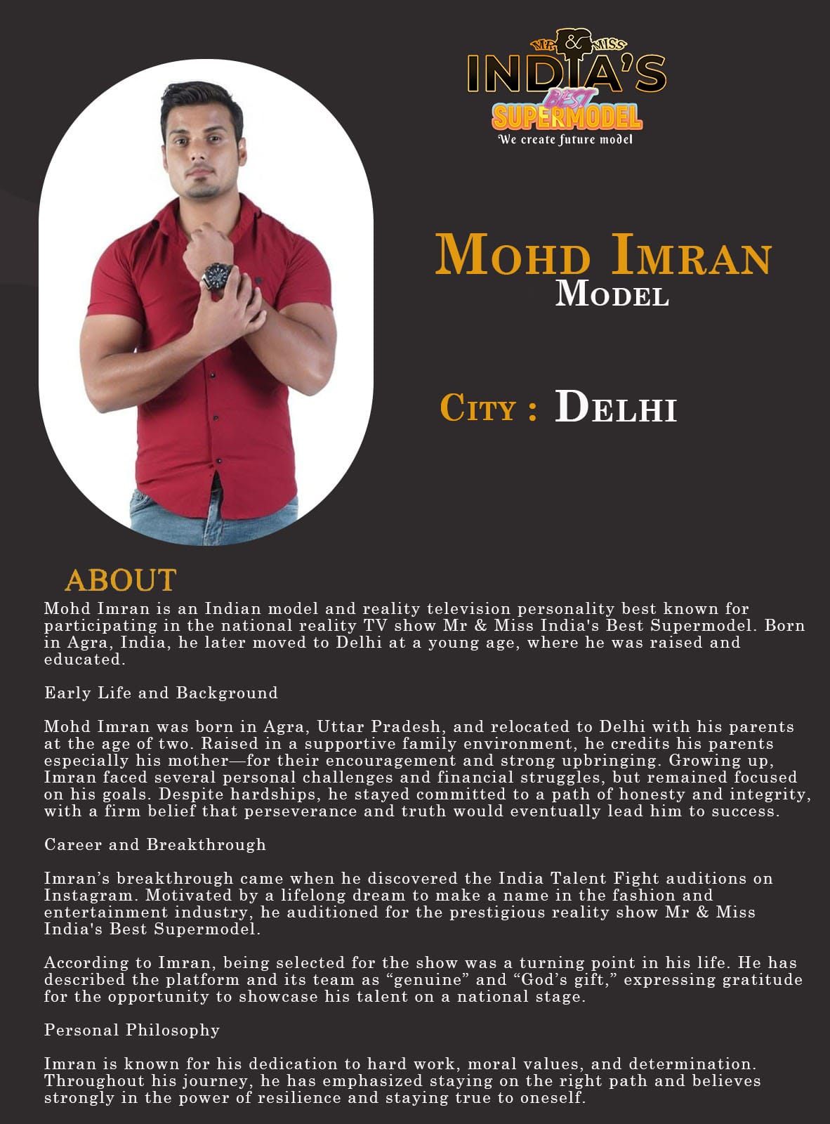 ITF Model Mohd Imran DelhiMohd Imran is an Indian model and reality television personality best known for participating in the national reality TV show Mr & Miss India’s Best Supermodel. Born in Agra, India, he later moved to Delhi at a young age, where he was raised and educated.Early Life and BackgroundMohd Imran was born in Agra, Uttar Pradesh, and relocated to Delhi with his parents at the age of two. Raised in a supportive