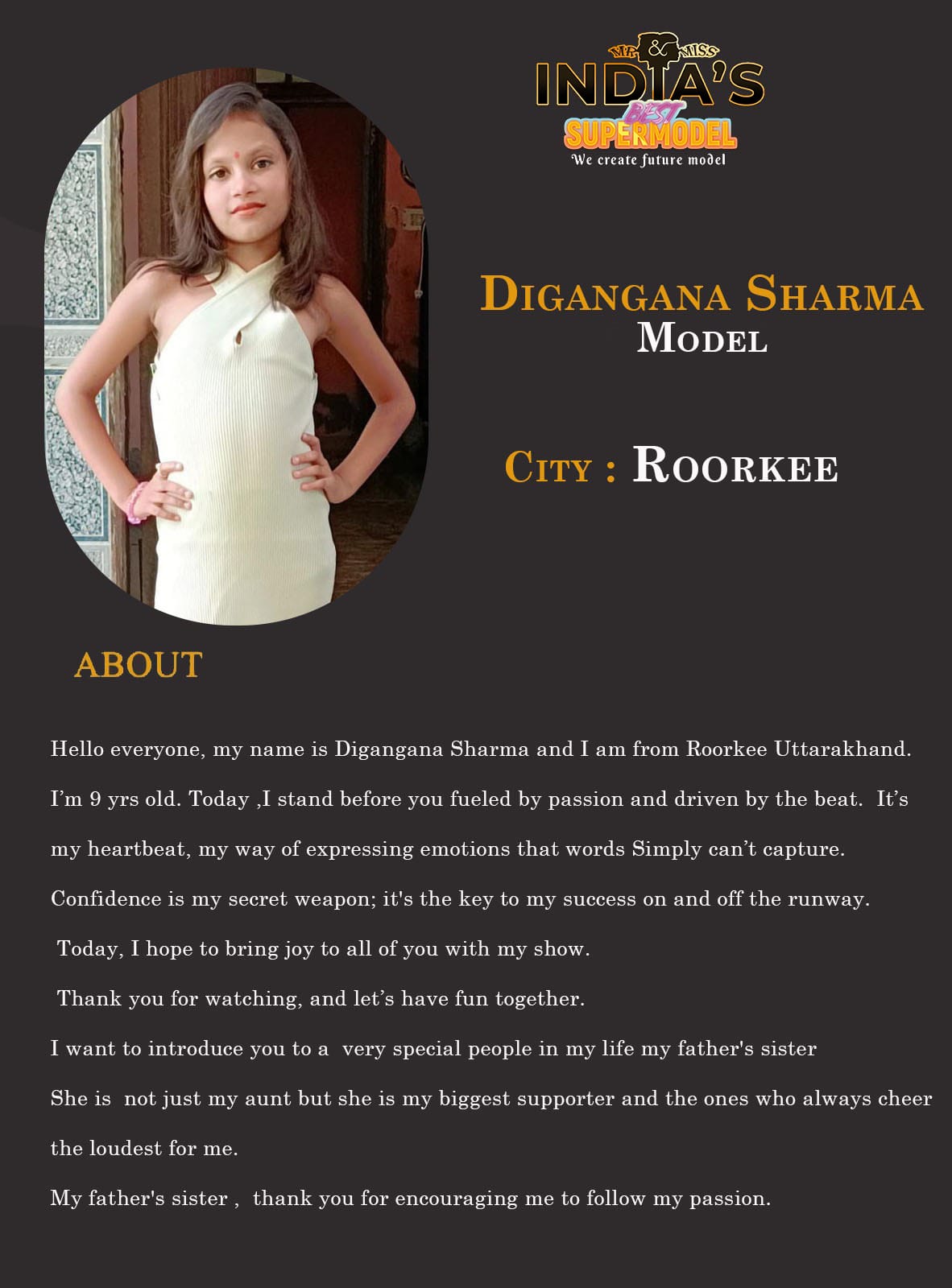 ITF Model Digangana Sharma RoorkeeHello everyone, my name is Digangana Sharma and I am from Roorkee Uttarakhand. I’m 9 yrs old. Today ,I stand before you fueled by passion and driven by the beat. It’s my heartbeat, my way of expressing emotions that words Simply can’t capture. Confidence is my secret weapon; it’s the key to my success on and off the runway.Today, I hope to bring joy to all of you with my show.Thank