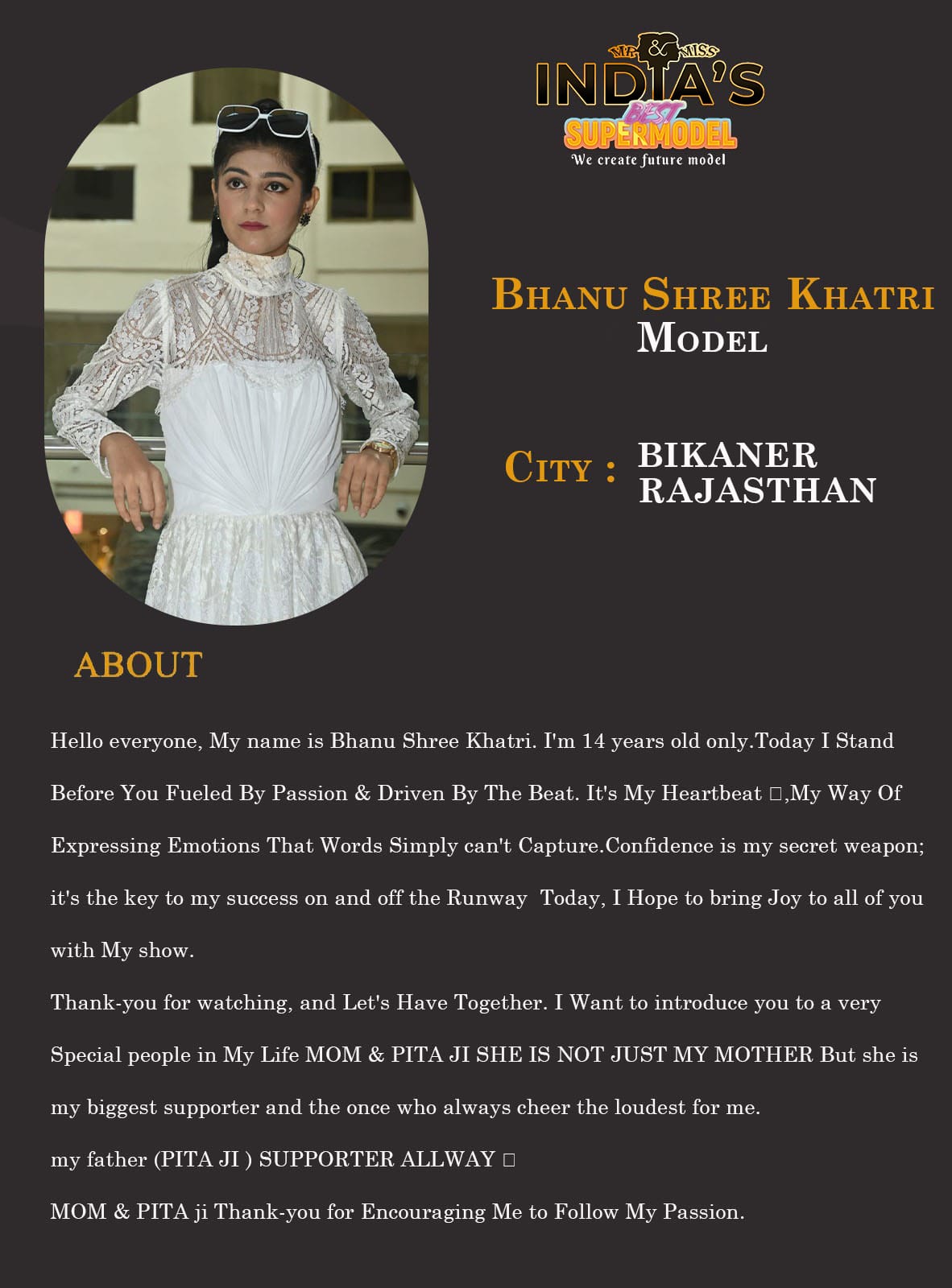 ITF Model Bhanu Shree Khatri Bikaner RajasthanHello everyone, My name is Bhanu Shree Khatri. I’m 14 years old only.Today I Stand Before You Fueled By Passion & Driven By The Beat. It’s My Heartbeat 💓,My Way Of Expressing Emotions That Words Simply can’t Capture.Confidence is my secret weapon; it’s the key to my success on and off the Runway Today, I Hope to bring Joy to all of you with My show.Thank-you for watching, and