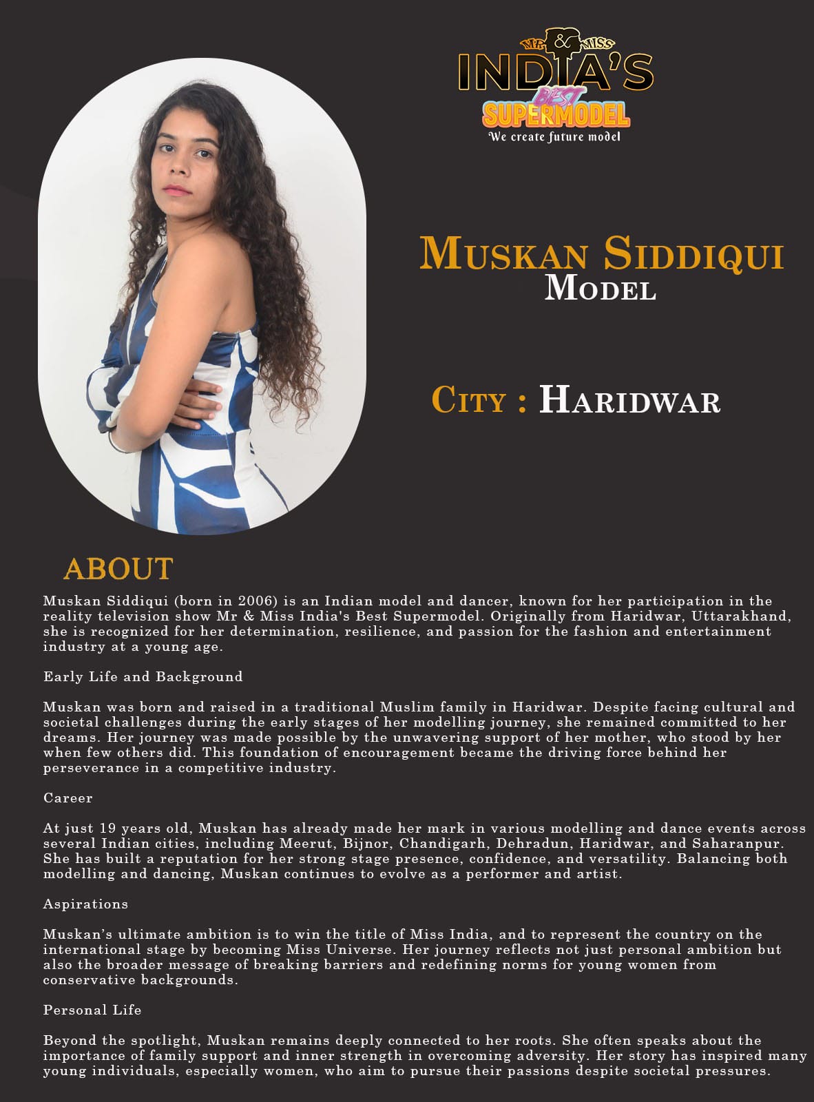 ITF Model Muskan Siddiqui HaridwarMuskan Siddiqui (born in 2006) is an Indian model and dancer, known for her participation in the reality television show Mr & Miss India’s Best Supermodel. Originally from Haridwar, Uttarakhand, she is recognized for her determination, resilience, and passion for the fashion and entertainment industry at a young age.Early Life and BackgroundMuskan was born and raised in a traditional Muslim family in Haridwar. Despite facing cultural and societal challenges during the