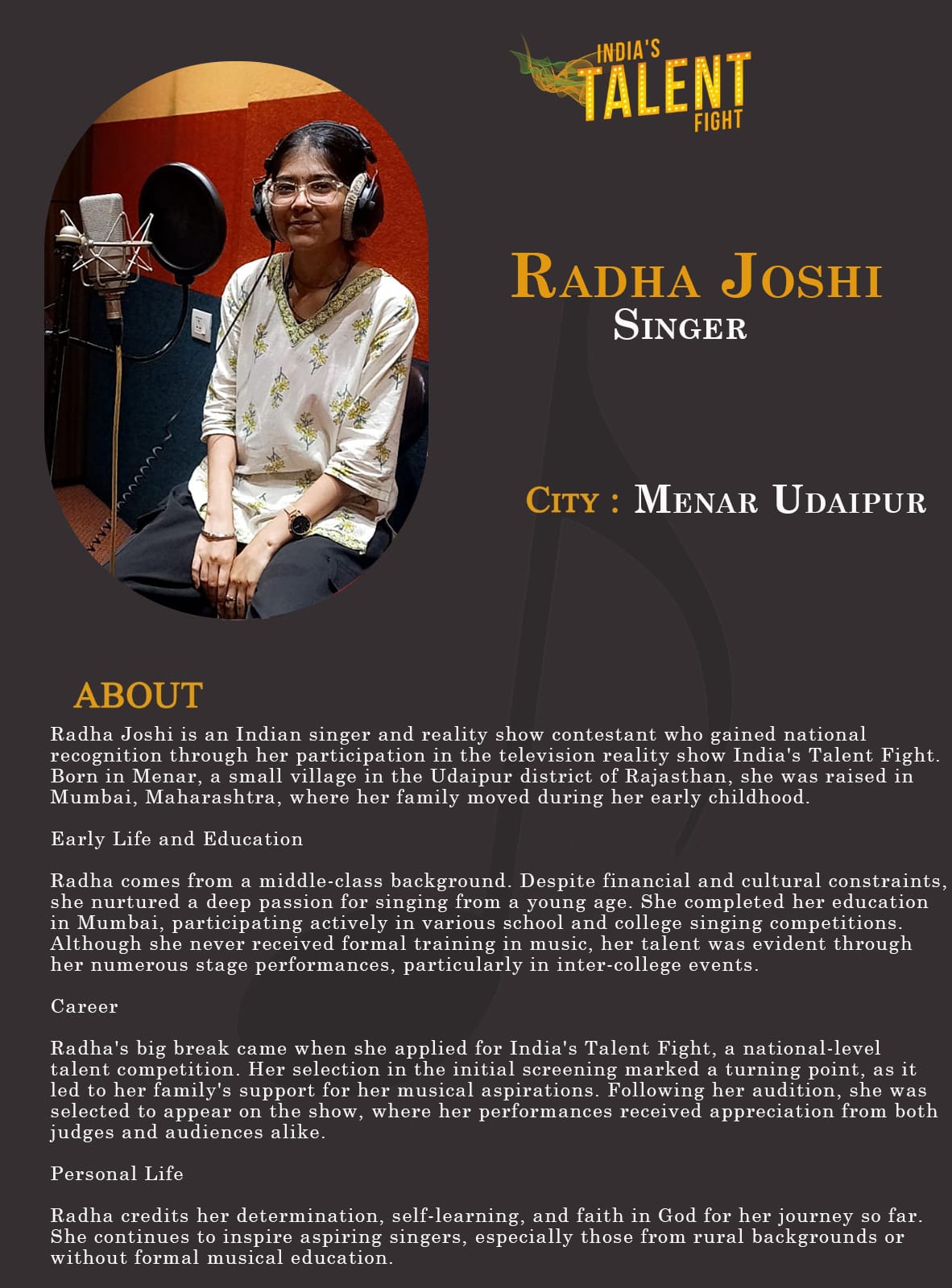 ITF Singer Radha Joshi Menar UdaipurRadha Joshi is an Indian singer and reality show contestant who gained national recognition through her participation in the television reality show India’s Talent Fight. Born in Menar, a small village in the Udaipur district of Rajasthan, she was raised in Mumbai, Maharashtra, where her family moved during her early childhood.Early Life and EducationRadha comes from a middle-class background. Despite financial and cultural constraints, she nurtured a deep passion for