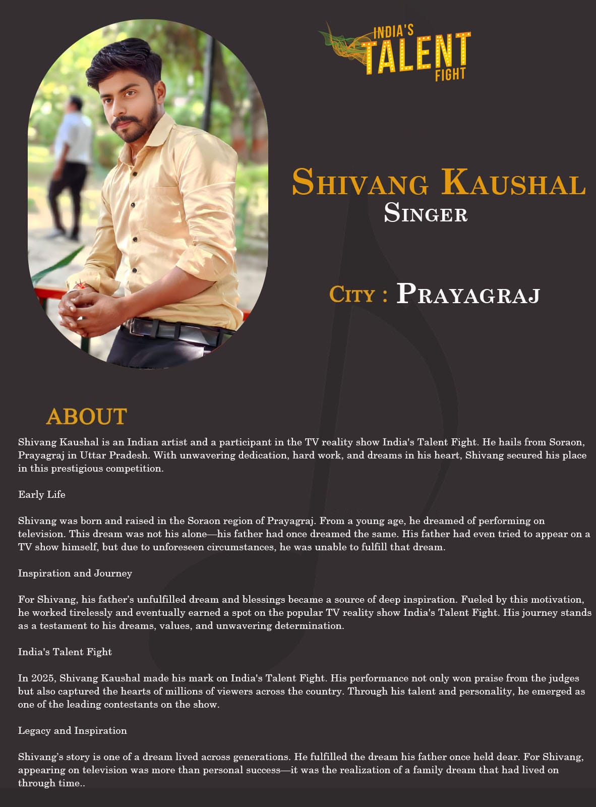 ITF Singer Shivang Kaushal PrayagrajShivang Kaushal is an Indian artist and a participant in the TV reality show India’s Talent Fight. He hails from Soraon, Prayagraj in Uttar Pradesh. With unwavering dedication, hard work, and dreams in his heart, Shivang secured his place in this prestigious competition.Early LifeShivang was born and raised in the Soraon region of Prayagraj. From a young age, he dreamed of performing on television. This dream was not his alone—his father