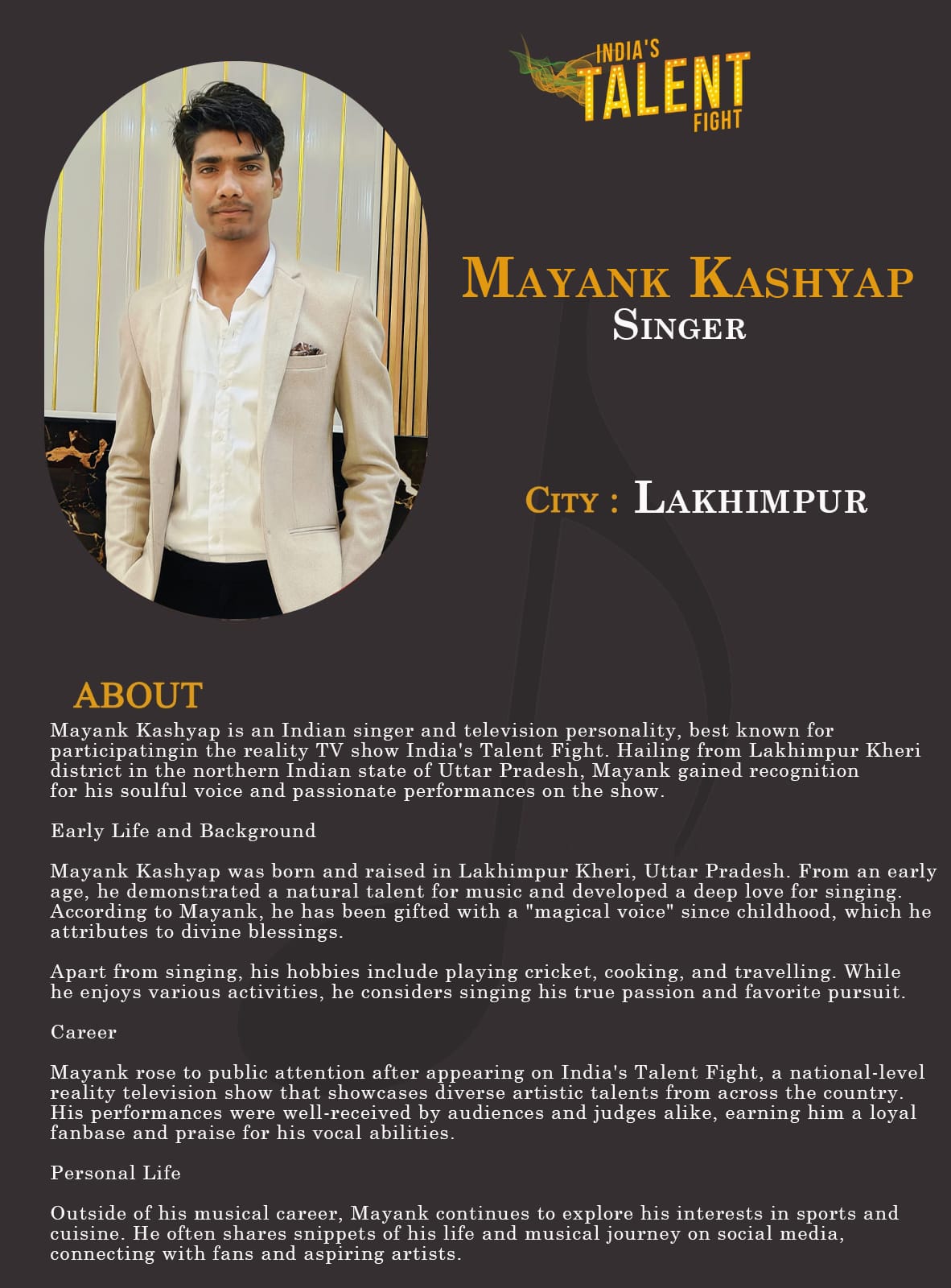 ITF Singer Mayank Kashyap LakhimpurMayank Kashyap is an Indian singer and television personality, best known for participating in the reality TV show India’s Talent Fight. Hailing from Lakhimpur Kheri district in the northern Indian state of Uttar Pradesh, Mayank gained recognition for his soulful voice and passionate performances on the show.Early Life and BackgroundMayank Kashyap was born and raised in Lakhimpur Kheri, Uttar Pradesh. From an early age, he demonstrated a natural talent for music
