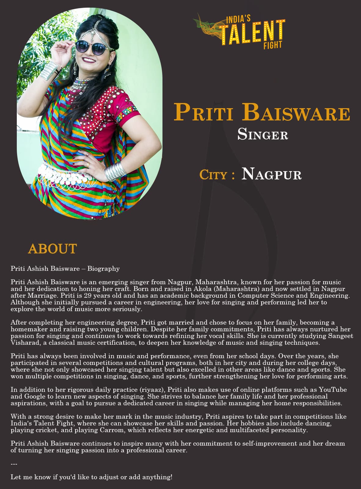 ITF Singer Priti Baisware NagpurPriti Ashish Baisware is an emerging singer from Nagpur, Maharashtra, known for her passion for music and her dedication to honing her craft. Born and raised in Akola (Maharashtra) and now settled in Nagpur after Marriage. , Priti is 29 years old and has an academic background in Computer Science and Engineering. Although she initially pursued a career in engineering, her love for singing and performing led her to explore the