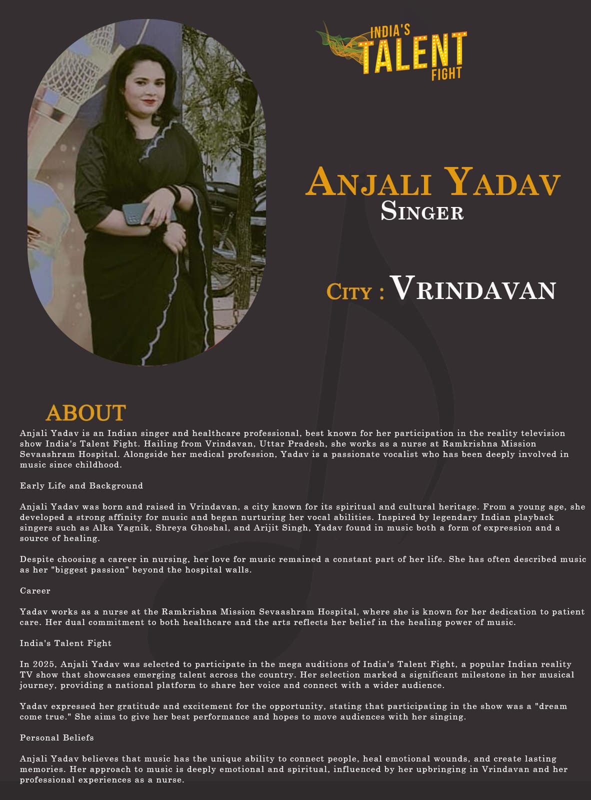 ITF Singer Anjali Yadav VrindavanAnjali Yadav is an Indian singer and healthcare professional, best known for her participation in the reality television show India’s Talent Fight. Hailing from Vrindavan, Uttar Pradesh, she works as a nurse at Ramkrishna Mission Sevaashram Hospital. Alongside her medical profession, Anjali is a passionate vocalist who has been deeply involved in music since childhood.Early Life and BackgroundAnjali Yadav was born and raised in Vrindavan, a city known for its spiritual